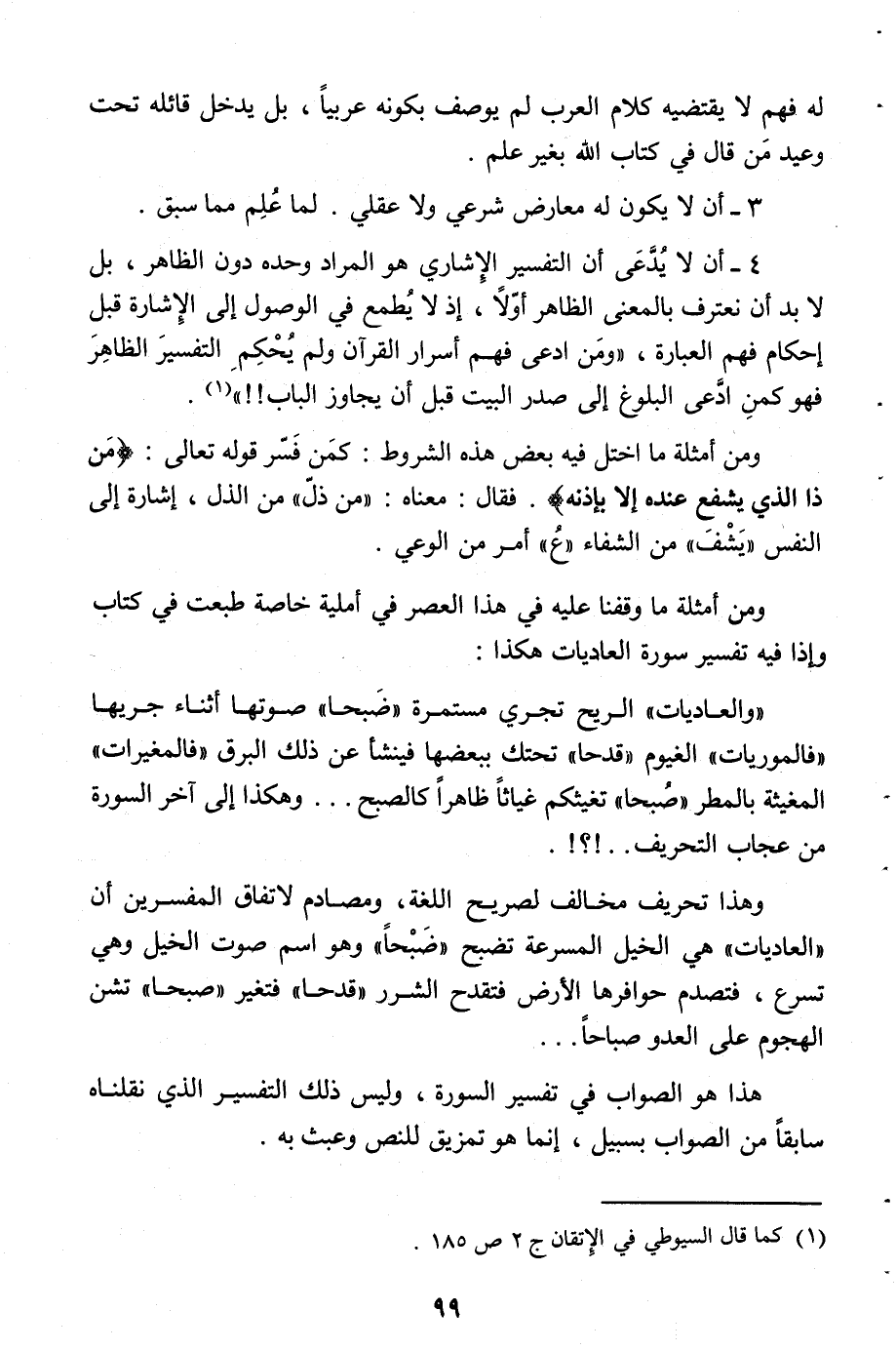 وهذا تحريف مخالف لصريح اللغة، ومصادم لاتفاق المفسرين أن «العاديات» هي الخيل المسرعة تضبح «ضبحا» وهو اسم صوت الخيل وهي تسرع، فتصدم حوافرها الأرض فتقدح الشرر «قدحا» فتغير «صبحا» تشن الهجوم على العدو صباحا ...
