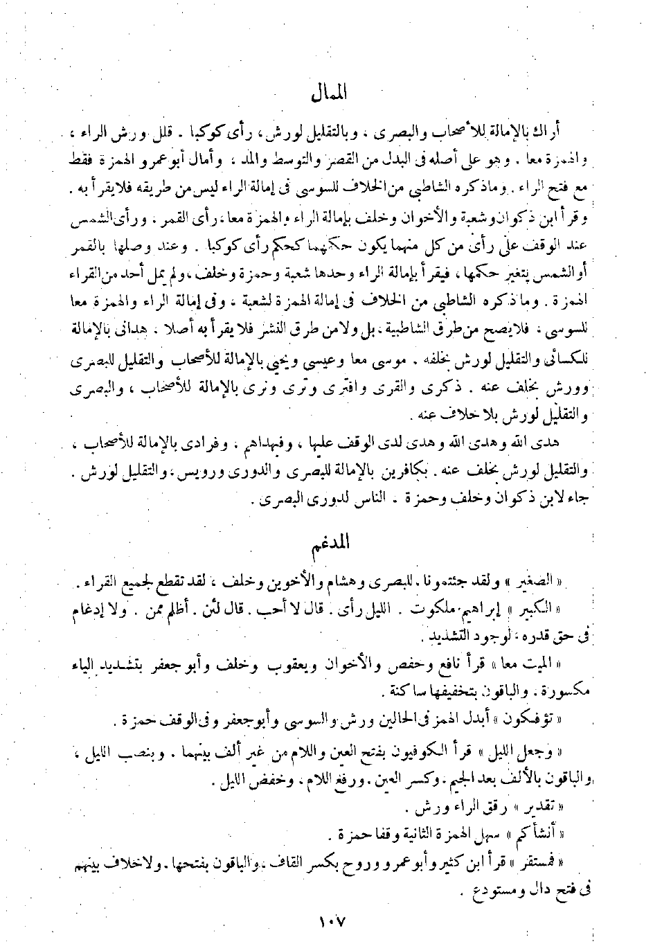 وقرأ ابن ذكوان وشعبة والأخوان وخلف بإمالة الراء والهمزة معا، رأى القمر، ورأى الشمس عند الوقف على رأى من كل منهما يكون حكمهما كحكم رأى كوكبا. وعند وصلها بالقمر أو الشمس يتغير حكمها، فيقرأ بإمالة الراء وحدها شعبة وحمزة وخلف، ولم يمل أحد من القراء الهمزة. وما ذكره الشاطبي من الخلاف في إمالة الهمزة لشعبة، وفي إمالة الراء والهمزة معا للسوسي، فلا يصح من طرق الشاطبية، بل ولا من طرق النشر فلا يقرأ به أصلا، هداني بالإمالة للكسائي والتقليل لورش بخلفه، موسى معا وعيسى ويحيى بالإمالة للأصحاب والتقليل للبصري وورش بخلف عنه. ذكرى والقرى وافترى وترى ونرى بالإمالة للأصحاب، والبصري والتقليل لورش بلا خلاف عنه.