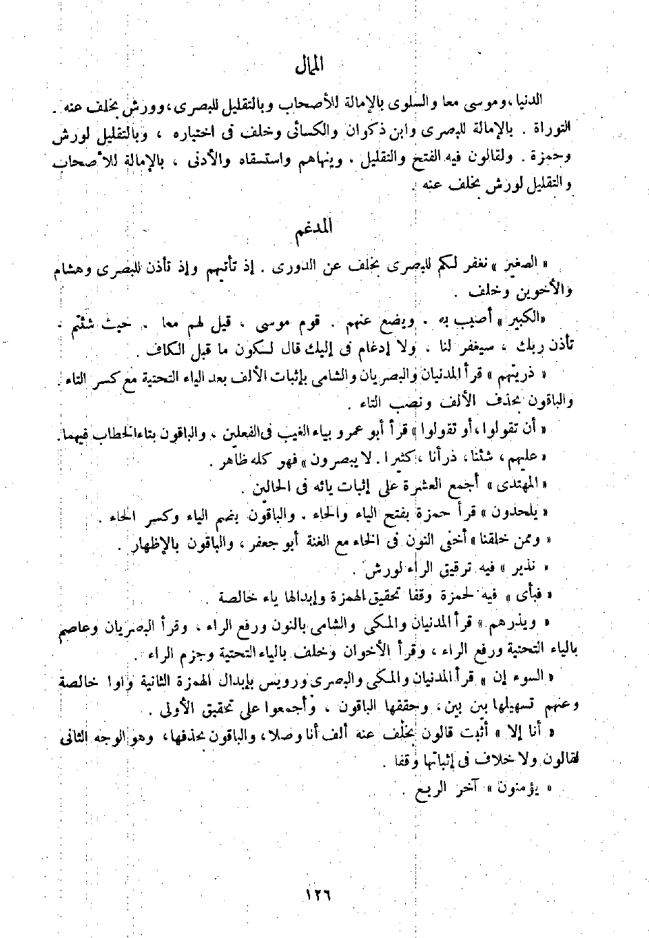 التوراة. بالإمالة للبصري وابن ذكوان والكسائي وخلف في اختياره، وبالتقليل لورش وحمزة. ولقالون فيه الفتح والتقليل، وينهاهم واستسقاه والأدنى، بالإمالة للأصحاب والتقليل لورش بخلف عنه.