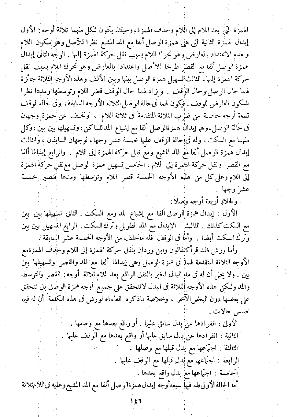 وأما ورش فقد قرأ كقالون وابن وردان بنقل حركة الهزة إلى اللام وحذف الهمزة مع الأوجه الثلاثة المتقدمة لهما في همزة الوصل وهي إبدالها ألفا مع المد والقصر وتسهيلها بين بين. ولا يخفى أن له في مد البدل المغير بالنقل الواقع بعد اللام ثلاثة أوجه: القصر والتوسط والمد، ولكن هذه الأوجه الثلاثة في البدل لا تتحقق على جميع أوجه همزة الوصل، بل تتحقق على بعضها دون البعض الآخر، وخلاصة ما ذكره العلماء لورش في هذه الكلمة أن له فيها خمس حالات.