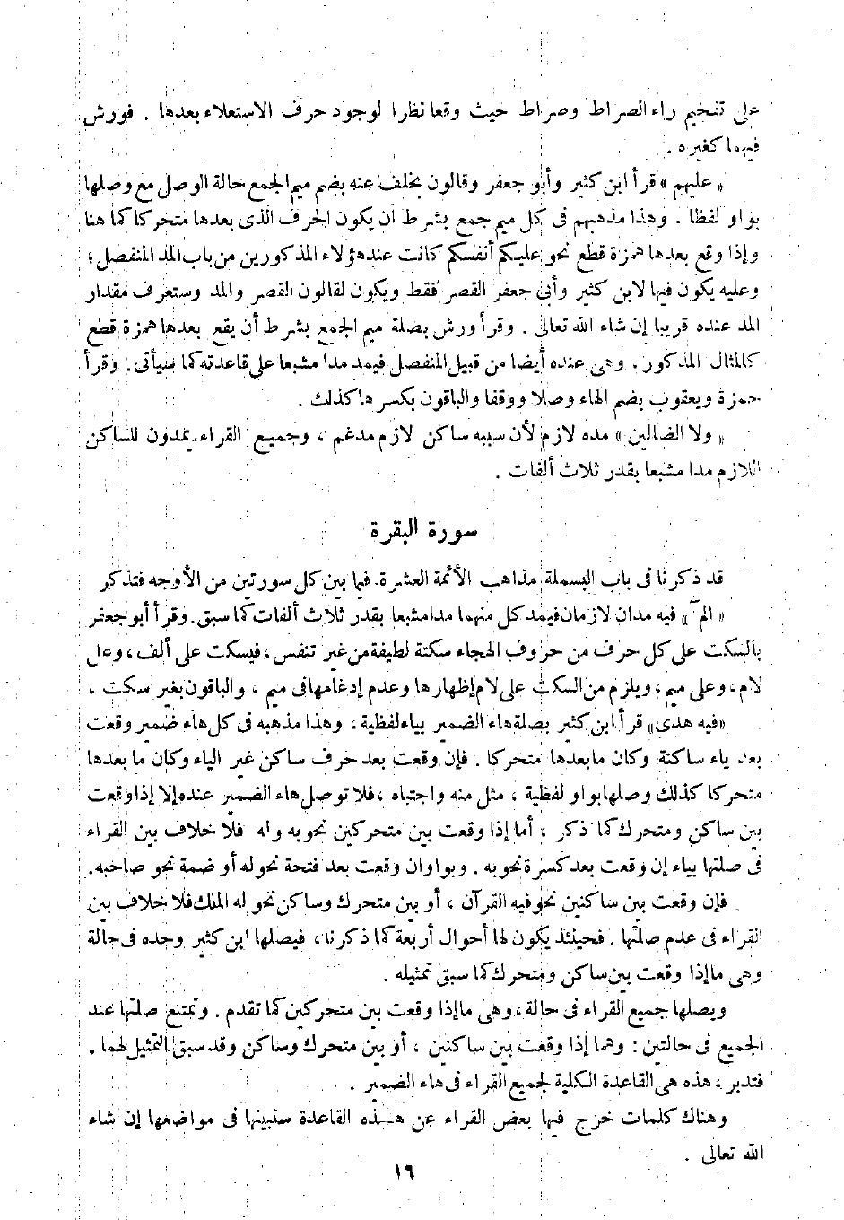 " فيه هدى " قرأ ابن كثير بصلة هاء الضمير بياء لفظية، وهذا مذهبه في كل هاء ضمير وقعت بعد ياء ساكنة وكان ما بعدها متحركا. فإن وقعت بعد حرف ساكن غير الياء وكان ما بعدها متحركا كذلك وصلها بواو لفظية، مثل منه واجتباه، فلا توصل هاء الضمير عنده إلا إذا وقعت بين ساكن ومتحرك كما ذكر، أما إذا وقعت بين متحركين نحو به وله فلا خلاف بين القراء في صلتها بياء إن وقعت بعد كسرة نحو به. وبواو إن وقعت بعد فتحة نحو له أو ضمة نحو صاحبه.