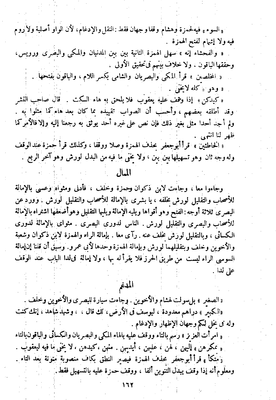 وجاءوا معا، وجاءت لابن ذكوان وحمزة وخلف، فأدلى ومثواه وعسى بالإمالة للأصحاب والتقليل لورش بخلفه، يا بشرى بالإمالة للأصحاب والتقليل لورش. وورد عن البصري ثلاثة أوجه: الفتح وهو أقواها ويليه الإمالة ويليها التقليل وهو أضعفها اشتراه بالإمالة للأصحاب والبصري والتقليل لورش. الناس لدوري البصري. مثواي بالإمالة لدوري الكسائي، وبالتقليل لورش بخلف عنه. رآى معا. بإمالة الراء والهمزة لابن ذكوان وشعبة والأخوين وخلف وبتقليلهما لورش وبإمالة الهمزة وحدها لأبي عمرو. وسبق أن قلنا إن إمالة السوسي الراء ليست من طريق الحرز فلا يقرأ له بها، ولا إمالة في لدا الباب عند الوقف على لدا.