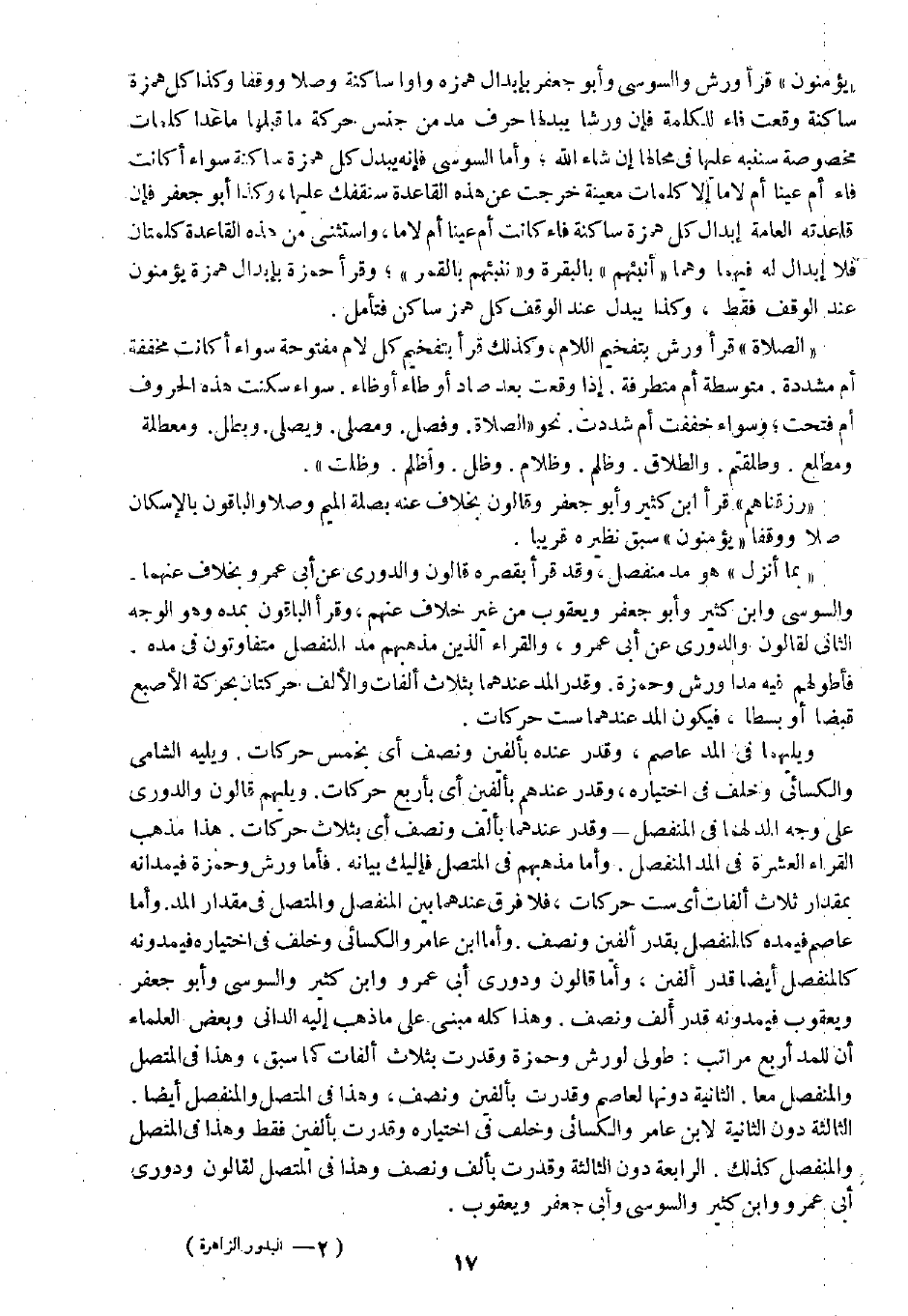 ويليهما في المد عاصم، وقدر عنده بألفين ونصف أي بخمس حركات. ويليه الشامي والكسائي وخلف في اختياره، وقدر عندهم بألفين أي بأربع حركات. ويليهم قالون والدوري على وجه المد لهما في المنفصل - وقدر عندهما بألف ونصف أي بثلاث حركات. هذا مذهب القراء العشرة في المد المنفصل، وأما مذهبهم في المتصل فإليك بيانه. فأما ورش وحمزة فيمدانه بمقدار ثلاث ألفات أي ست حركات، فلا فرق عندهما بين المنفصل والمتصل في مقدار المد. وأما عاصم فيمده كالمنفصل بقدر ألفين ونصف. وأما ابن عامر والكسائي وخلف في اختياره فيمدونه كالمنفصل أيضا قدر ألفين، وأما قالون ودوري أبي عمرو وابن كثير والسوسي وأبو جعفر ويعقوب فيمدونه قدر ألف ونصف. وهذا كله مبني على ما ذهب إليه الداني وبعض العلماء أن للمد أربع مراتب: طولي لورش وحمزة وقدرت بثلاث ألفات كما سبق، وهذا في المتصل والمنفصل معا. الثانية دونها لعاصم وقدرت بألفين ونصف، وهذا في المتصل والمنفصل أيضا.