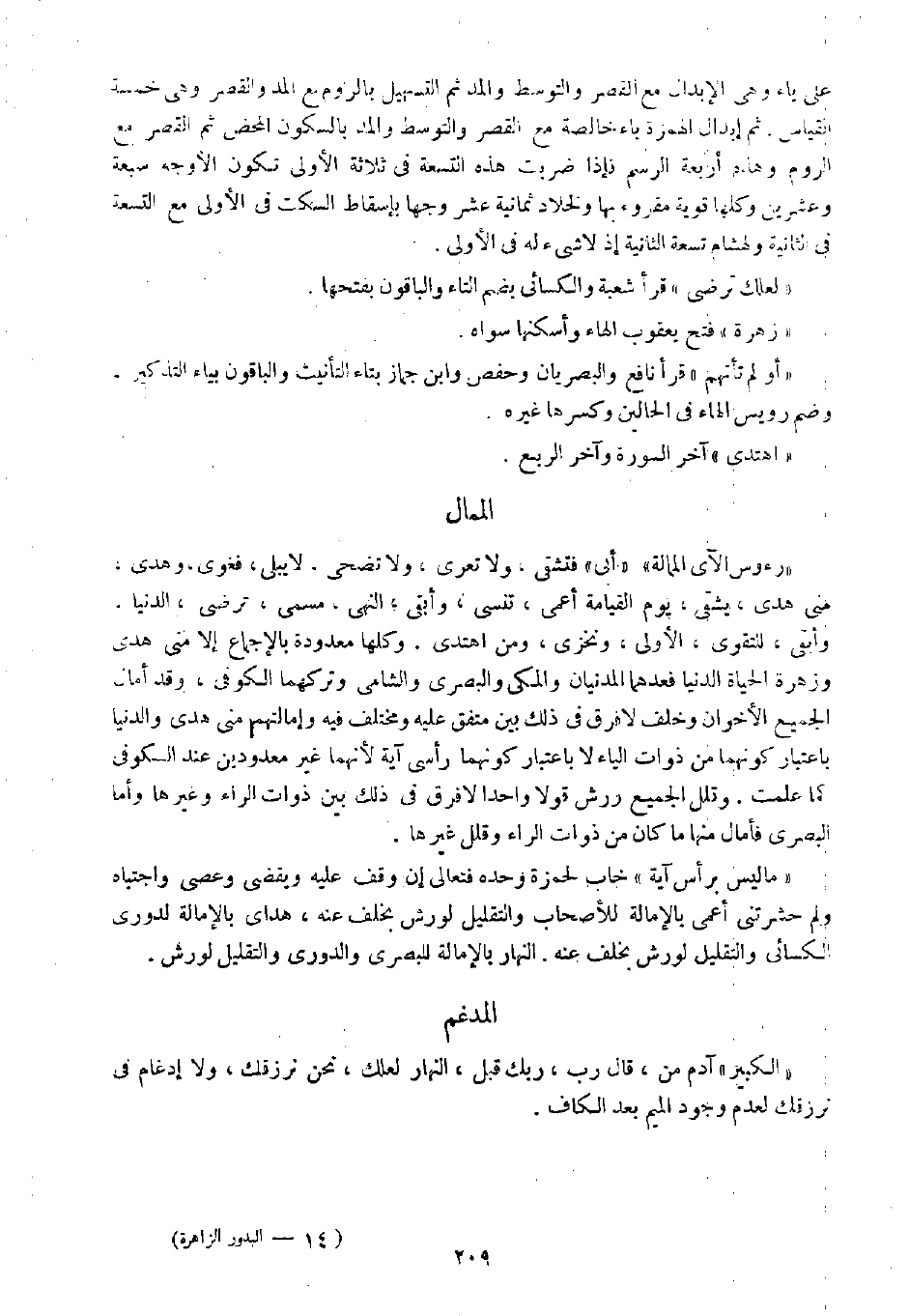 " رءوس الآي الممالة " " أبى " فتشقى، ولا تعرى، ولا تضحى، لايبلى، فغوى، وهدى، مني هدى، يشقى، يوم القيامة أعمى، تنسى، وأبقى؛ النهى، مسمى، ترضى، الدنيا، وأبقى، للتقوى، الأولى، ونخزى، ومن اهتدى. وكلها معدودة بالإجماع إلا منى هدى وزهرة الحياة الدنيا فعدهما المدنيان والمكي والبصري والشامي وتركهما الكوفي، وقد أمال الجميع الأخوان وخلف لا فرق في ذلك بين متفق عليه ومختلف فيه وإمالتهم مني هدى والدنيا باعتبار كونهما من ذوات الياء لا باعتبار كونهما رأسي آية لأنهما غير معدودين عند الكوفي كما علمت. وقلل الجميع ورش قولا واحدا لا فرق في ذلك بين ذوات الراء وغيرها وأما البصري فأمال منها ما كان من ذوات الراء وقلل غيرها.
