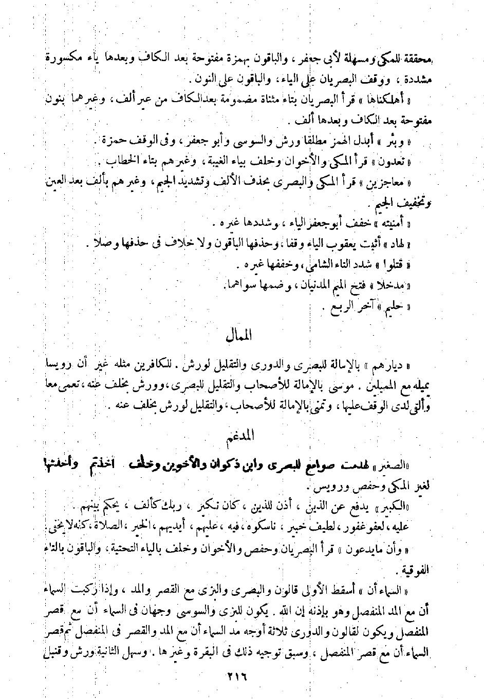 " ديارهم " بالإمالة للبصري والدوري والتقليل لورش. للكافرين مثله غير أن رويسا يميله مع المميلين. موسى بالإمالة للأصحاب والتقليل للبصري، وورش بخلف عنه، تعمى معا وألقى لدى الوقف عليها، وتمنى بالإمالة للأصحاب، والتقليل لورش بخلف عنه.