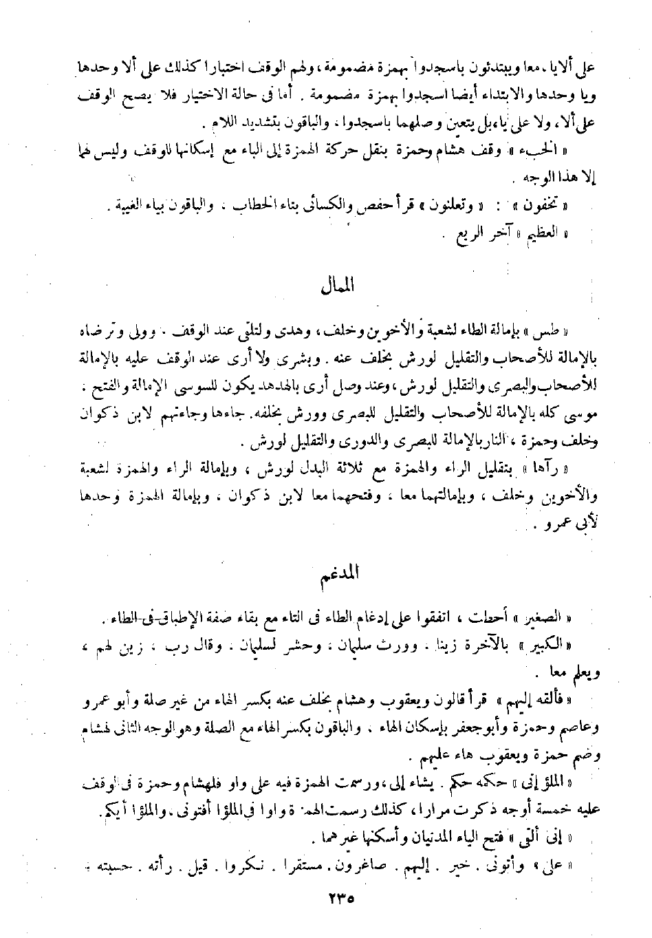 على ألا يا، معا ويبتدئون باسجدوا بهمزة مضمومة نولهم الوقف اختبارا كذلك على ألا وحدها ويا وحدها والابتداء أيضا اسجدوا بهمزة مضمومة. أما في حالة الاختيار فلا يصح الوقف على ألا، ولا على يا، بل يتعين وصلهما باسجدوا، والباقون بتشديد اللام.