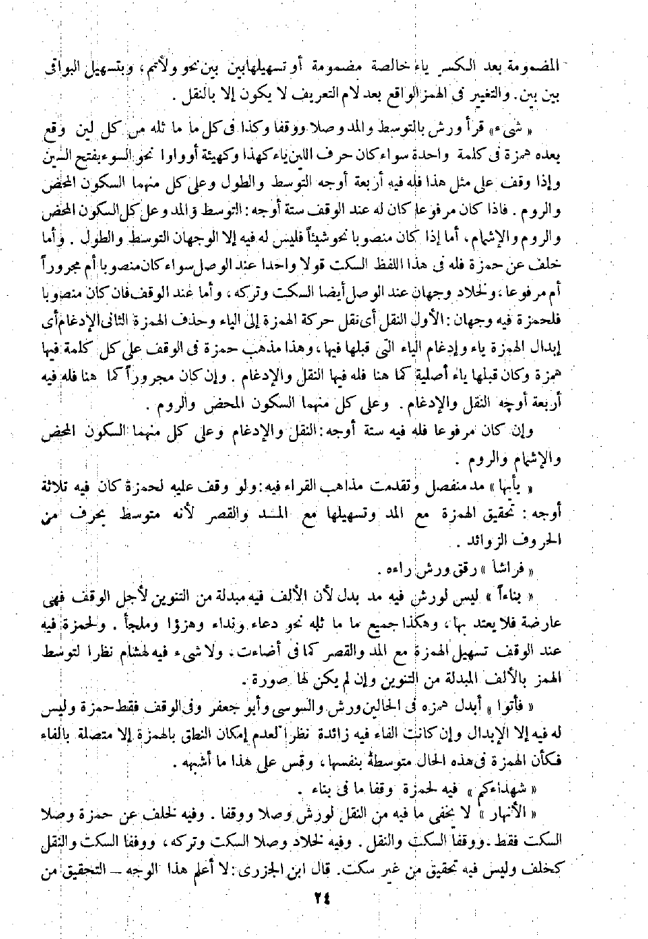 " شيء " قرأ ورش بالتوسط والمد وصلا ووقفا وكذا في كل ما ماثله من كل لين وقع بعده همزة في كلمة واحدة سواء كان حرف اللين ياء كهذا وكهيئة أو واوا نحو السوء بفتح السين وإذا وقفت على مثل هذا فله فيه أربعة أوجه التوسط والطول وعلى كل منهما السكون المحض والروم. فاذا كان مرفوعا كان له عند الوقف ستة أوجه: التوسط والمد وعلى كل السكون المحض والروم والإشمام، أما إذا كان منصوبا نحو شيئا فليس له فيه إلا الوجهان التوسط والطول. وأما خلف عن حمزة فله في هذا اللفظ السكت قولا واحدا عند الوصل سواء كان منصوبا أم مجرورًا أم مرفوعا، ولخلاد وجهان عند الوصل أيضا السكت وتركه، وأما عند الوقف فان كان منصوبا فلحمزة فيه وجهان " الأول: النقل أي نقل حركة الهمزة إلى الياء وحذف الهمزة، الثاني: الإدغام أي إبدال الهمزة ياء وإدغام الياء التي قبلها فيها، وهذا مذهب حمزة في الوقف على كل كلمة فيها همزة وكان قبلها ياء أصلية كما هنا فله فيها النقل والإدغام. وإن كان مجرورًا كما هنا فله فيه أربعة أوجه النقل والإدغام. وعلى كل منهما السكون المحض والروم.