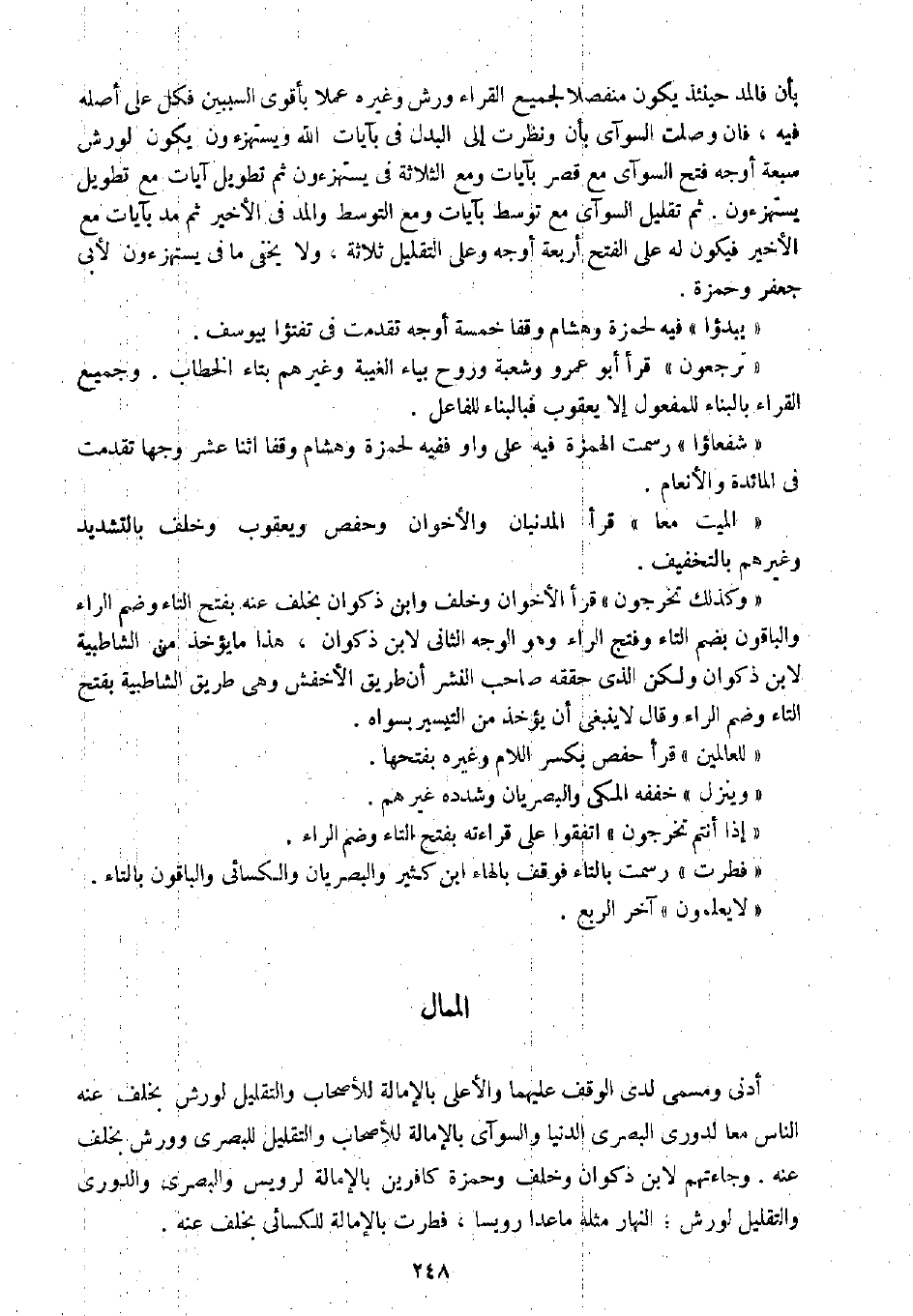 أدنى ومسمى لدى الوقف عليهما والأعلى بالإمالة للأصحاب والتقليل لورش بخلف عنه الناس معا لدوري البصري الدنيا والسوآى بالإمالة للأصحاب والتقليل للبصري وورش بخلف عنه. وجاءتهم لابن ذكوان وخلف وحمزة كافرين بالإمالة لرويس والبصري والدوري، التقليل لورش؛ النهار مثله ما عدا رويسا، فطرت بالإمالة للكسائي بخلف عنه.