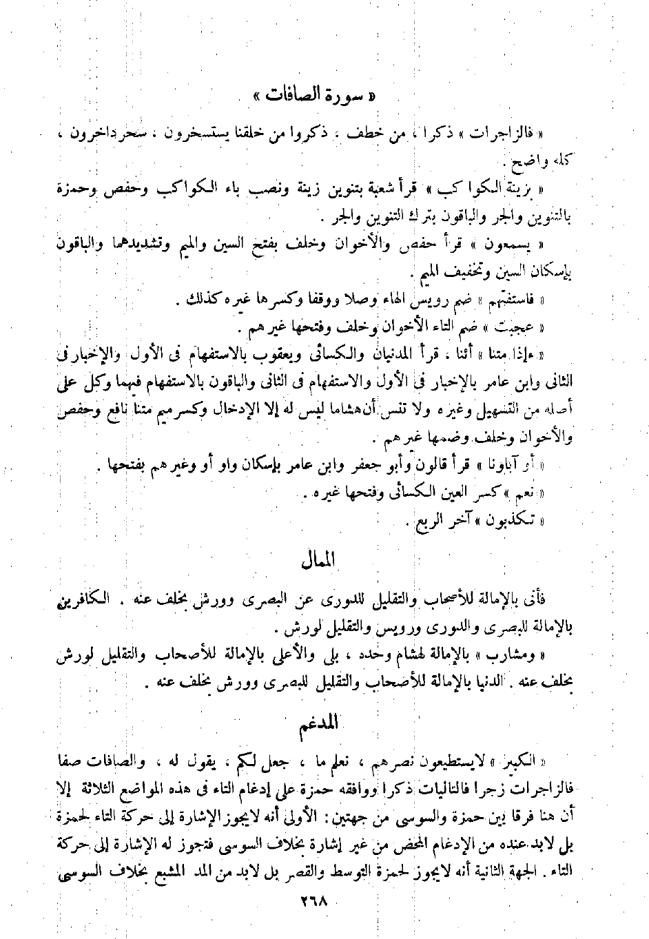 " الكبير " لا يستطيعون نصرهم، نعلم ما، جعل لكم، يقول له، والصافات صفا فالزاجرات زجرا فالتاليات ذكرا ووافقه حمزة على إدغام التاء في هذه المواضع الثلاثة إلا أن هنا فرقا بين حمزة والسوسي من جهتين: الأولى أنه لا يجوز الإشارة إلى حركة التاء لحمزة بل لابد عنده من الإدغام المحض من غير إشارة بخلاف السوسي فتجوز له الإشارة إلى حركة التاء. الجهة الثانية أنه لا يجوز لحمزة التوسط والقصر بل لابد من المد المشبع بخلاف السوسي