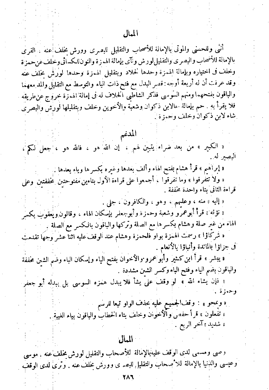 أنثى وللحسنى والموتى بالإمالة للأصحاب والتقليل للبصري وورش بخلف عنه. القرى بالإمالة للأصحاب والبصري والتقليل لورش ونآى بإمالة الهمزة والنون للكسائي وخلف عن حمزة وخلف في اختياره وبإمالة الهمزة وحدها لخلاد وبتقليل الهمزة وحدها لورش بخلف عنه وقد عرفت أن له أربعة أوجه: قصر البدل مع فتح ذات الباء والتوسط مع التقليل والمد معهما والباقون بفتحهما ومنهم السوسي فذكر الشاطبي الخلاف له في إمالة الهمزة خروج عن طريقه فلا يقرأ به. حم بإمالة حا لابن ذكوان وشعبة والأخوين وخلف وبتقليلها لورش والبصري شاء لابن ذكوان وخلف وحمزة.