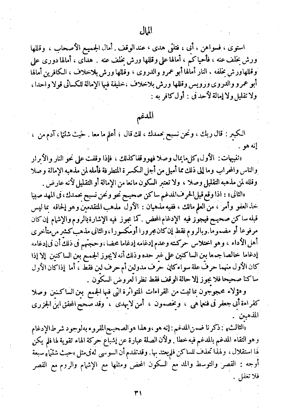 " تنبيهات: الأول " كل ما يمال وصلا فهو وقفا كذلك، فإذا وقفت على نحو النار والأبرار والناس والمحراب وما إلى ذلك مما أميل من أجل الكسرة المتطرفة فأمله لمن مذهبه الإمالة وصلا وقلله لمن مذهبه التقليل وصلا. ولا تعتبر السكون مانعا من الإمالة أو التقليل لأنه عارض.