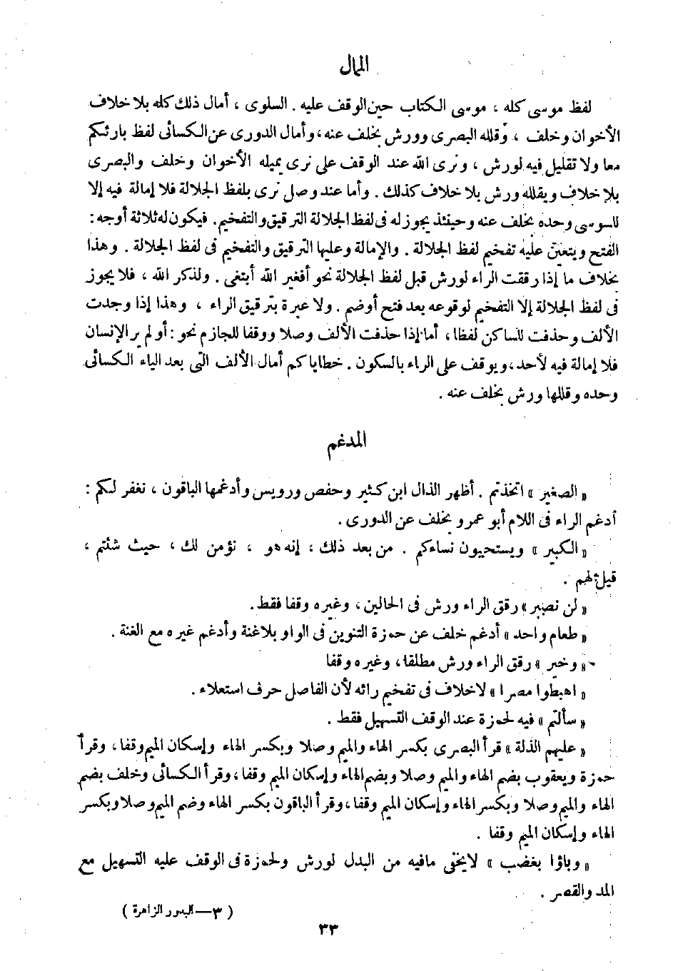 لفظ موسى كله، موسى الكتاب حين الوقف عليه. السلوى، أمال ذلك كله بلا خلاف الأخوان وخلف، وقلله البصري وورش بخلف عنه، وأمال الدوري عن الكسائي لفظ بارئكم معا ولا تقليل فيه لورش، ونرى الله عند الوقف على نرى يميله الأخوان وخلف والبصري بلا خلاف ويقلله ورش بلا خلاف كذلك. وأما عند وصل نرى بلفظ الجلالة فلا إماله فيه إلا للسوسي وحده بخلف عنه وحينئذ يجوز له في لفظ الجلالة الترقيق والتفخيم. فيكون له ثلاثة أوجه: الفتح ويتعين عليه تفخيم لفظ الجلالة. والإمالة وعليها الترقيق والتفخيم في لفظ الجلالة. وهذا بخلاف ما إذا رققت الراء لورش قبل لفظ الجلالة نحو أفغير الله أبتغي. ولذكر الله، فلا يجوز في لفظ الجلالة إلا التفخيم لوقوعه بعد فتح أو ضم. ولا عبرة بترقيق الراء، وهذا إذا وجدت الألف وحذفت للساكن لفظا، أما إذا حذفت الألف وصلا ووقفا للجازم نحو: أو لم ير الإنسان فلا إمالة فيه لأحد، ويوقف على الراء بالسكون. خطاياكم أمال الألف التي بعد الياء الكسائي وحده وقللها ورش بخلف عنه.