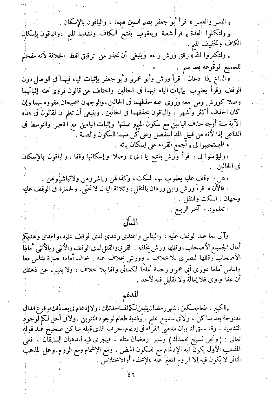 " الكبير " طعام مسكين، شهر رمضان، يتبين لكم المساجد، تلك، ولا إدغام في بعد ذلك لوقوع الدال مفتوحة بعد ساكن، ولا في سميع عليم، وفدية طعام لوجود التنوين، ولا في أحل لكم لوجود التشديد، وقد سبق لنا بيان مذهبي القراء في إدغام الحرف الذي قبله ساكن صحيح عند قوله تعالى: (ونحن نسبح بحمدك) وشهر رمضان مثله، فيجري فيه المذهبان السابقان، فعلى المذهب الأول يكون فيه الإدغام مع السكون المحض، ومع الإشمام ومع الروم، وعلى المذهب الثاني لا يكون فيه إلا الروم المعبر عنه بالإخفاء أو الاختلاس.