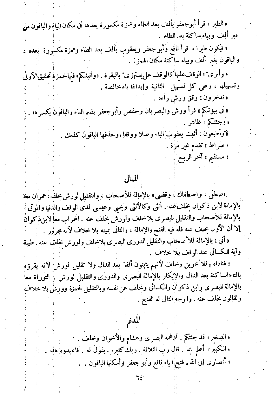 " اصطفى، واصطفاك، وقضى " بالإمالة للأصحاب، والتقليل لورش بخلفه، عمران معا بالإمالة لابن ذكوان بخلف عنه. أنثى وكالأنثى ويحيى وعيسى لدى الوقف والدنيا والموتى، بالإمالة للأصحاب والتقليل للبصري بلا خلف ولورش بخلف عنه. المحراب معا لابن ذكوان إلا أن الأول بخلف عنه فله فيه الفتح والإمالة، والثاني يميله بلا خلاف لأنه مجرور.