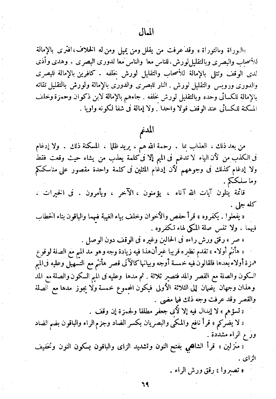 " التوراة وبالتوراة " وقد عرفت من يقلل ومن يميل ومن له الخلاف، افترى بالإمالة للأصحاب والبصري وبالتقليل لورش، للناس معا والناس معا لدوري البصري، وهدى وأذى لدى الوقف وتتلى بالإمالة للأصحاب والتقليل لورش بخلفه، كافرين بالإمالة للبصري والدوري ورويس والتقليل لورش. النار للبصري والدوري بالإمالة ولورش بالتقليل تقاته بالإمالة للكسائي وحده وبالتقليل لورش بخلفه. جاءهم بالإمالة لابن ذكوان وحمزة وخلف المسكنة للكسائي عند الوقف قولا واحدا. ولا إمالة في شفا لكونه واويا.