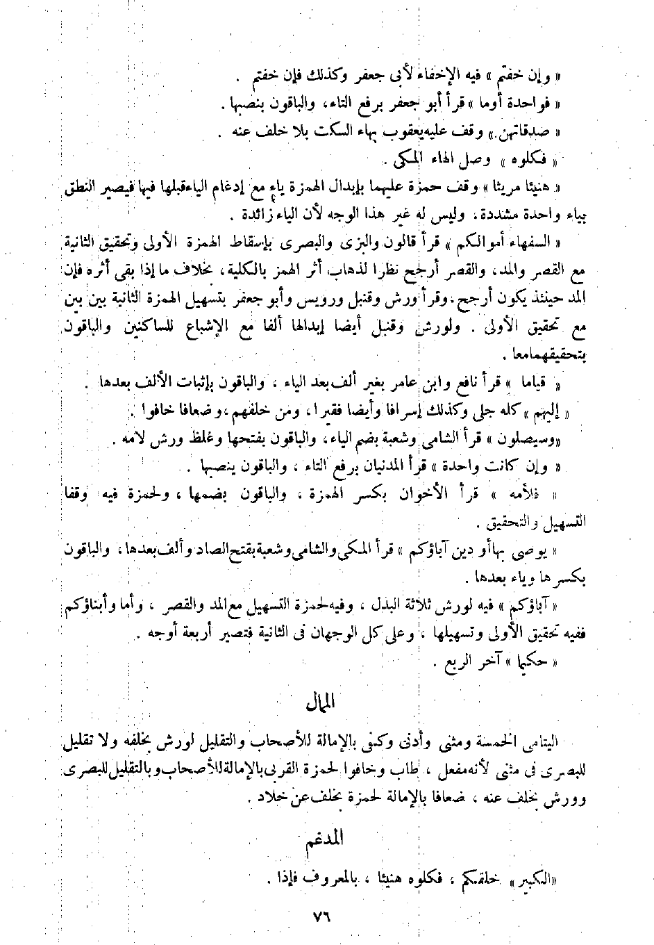 " السفهاء أموالكم " قرأ قالون والبزي والبصري بإسقاط الهمزة الأولى وتحقيق الثانية مع القصر والمد، والقصر أرجح نظرا لذهاب أثر الهمز بالكلية، بخلاف ما إذا بقي أثره فإن المد حينئذ يكون أرجح، وقرأ ورش وقنبل ورويس وأبو جعفر بتسهيل الهمزة الثانية بين بين مع تحقيق الأولى. ولورش وقنبل أيضا إبدالها ألفا مع الإشباع للساكنين والباقون بتحقيقهما معا.