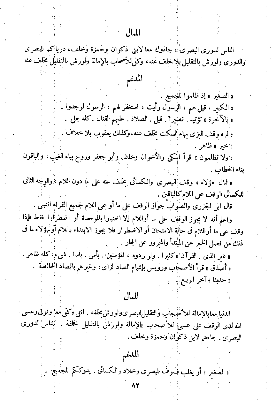 الدنيا معا بالإمالة للأصحاب والتقليل للبصري ولورش بخلفه. اتقى وكفى معا وتولى وعسى الله لدى الوقف على عسى للأصحاب بالإمالة ولورش بالتقليل بخلفه. للناس لدوري البصري. جاءهم لابن ذكوان وحمزة وخلف.