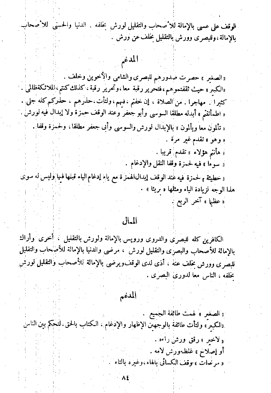 الكافرين كله للبصري والدوري ورويس بالإمالة ولورش بالتقليل، أخرى وأراك بالإمالة للأصحاب والبصري والتقليل لورش، مرضى والدنيا بالإمالة للأصحاب والتقليل للبصري وورش بخلف عنه، أذى لدى الوقف ويرضى بالإمالة للأصحاب والتقليل لورش بخلفه، الناس معا لدوري البصري.