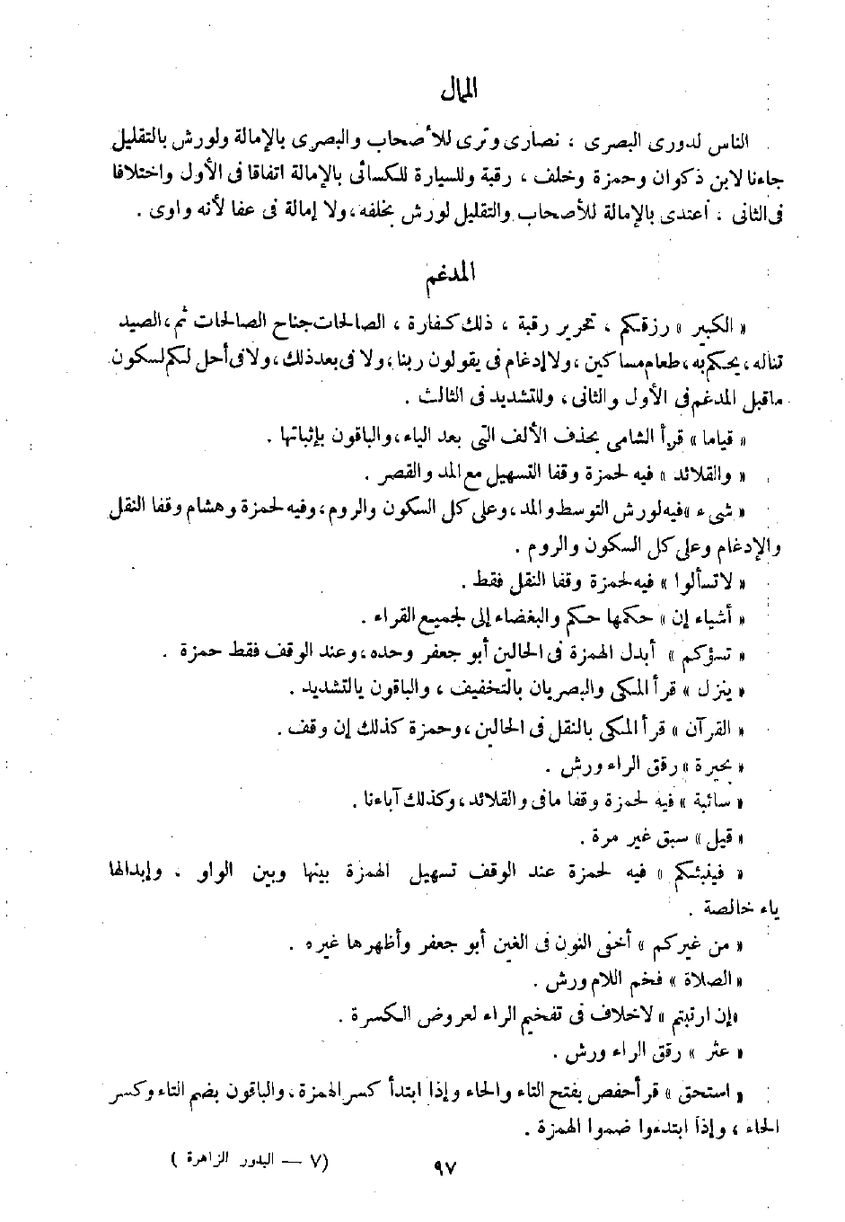 " الكبير " رزقكم، تحرير رقبة، ذلك كفارة، الصالحات جناح الصالحات ثم، الصيد تناله، يحكم به، طعاما مساكين، ولا إدغام في يقولون ربنا، ولا في بعد ذلك، ولا في أحل لكم لسكون ما قبل المدغم في الأول والثاني، وللتشديد في الثالث.