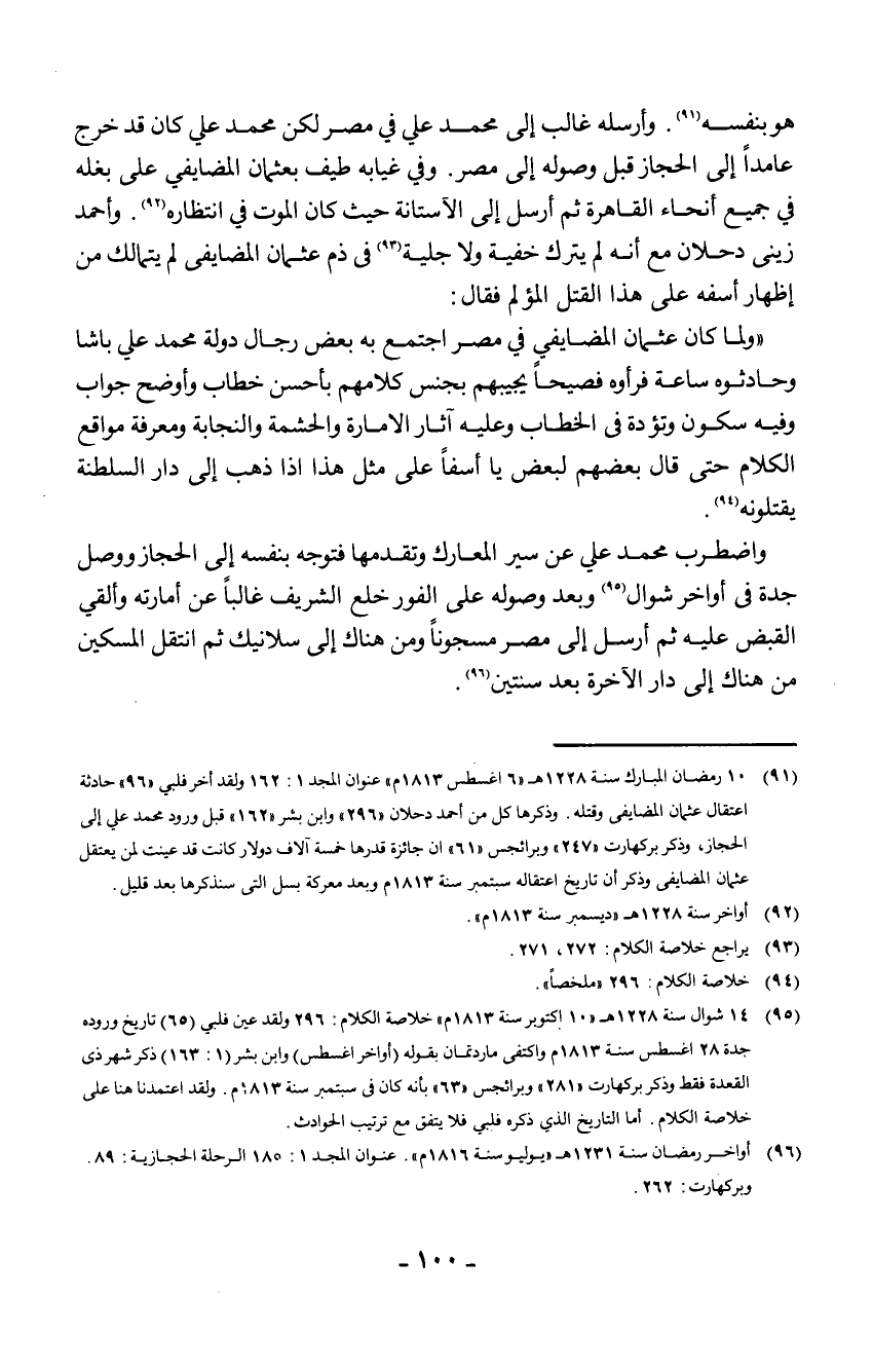 5 14 شوال سنة 1228 هـ "10 أكتوبر سنة 1813 م" خلاصة الكلام: 296، ولقد عين فلبي (65) تاريخ وروده جدة 28 أغسطس سنة 1813 م واكتفى ماردتمان بقوله (أواخر أغسطس) وابن بشر (1: 163) ذكر شهر ذي القعدة فقط، وذكر بركهارت "281" وبرائجس "63" بأنه كان في سبتمبر سنة 1813 م. ولقد اعتمدنا هنا على خلاصة الكلام. أما التاريخ الذي ذكره فلبي فلا يتفق مع ترتيب الحوادث.