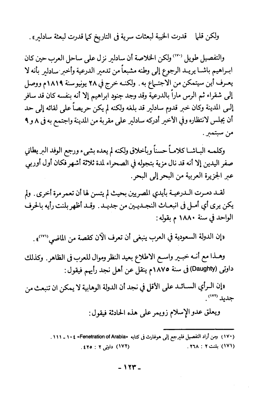 وهذا مع أنه خبير واسع الاطلاع بعيد النظر وموال للعرب في الظاهر. وكذلك داوتي (Daughty) في سنة 1875م ينقل عن أهل نجد رأيهم فيقول: "إن الرأي السائد على الأقل في نجد أن الدولة الوهابية لا يمكن أن تنبعث من جديد 3. ويعلق عدو الإسلام زويمر على هذه الحادثة فيقول: