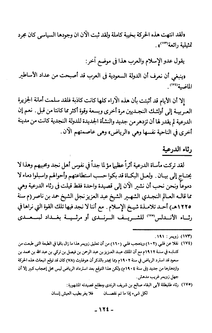 2 نقلا عن فلبي (102) ويتعجب فلبي (160) من أن تعليق زويمر هذا ما زال باقيا في الطبعة التي طبعت من كتابه في سنة 1912 م مع أن الملك عبد العزيز بن عبد الرحمن بن فيصل بن تركي بن عبد الله بن محمد بن سعود قد استرد الرياض (في سنة 1902م) ، ومما يجدر بالذكر أن هوغارث (78) كان قد توقع انبعاث هذه الحركة وازدهارها من جديد (في سنة 1904 م) ، ولكن هذا التوقع بعد استرداد الرياض ليس محل إعجاب كبير إلا أن جهل زويمر غريب مدهش.