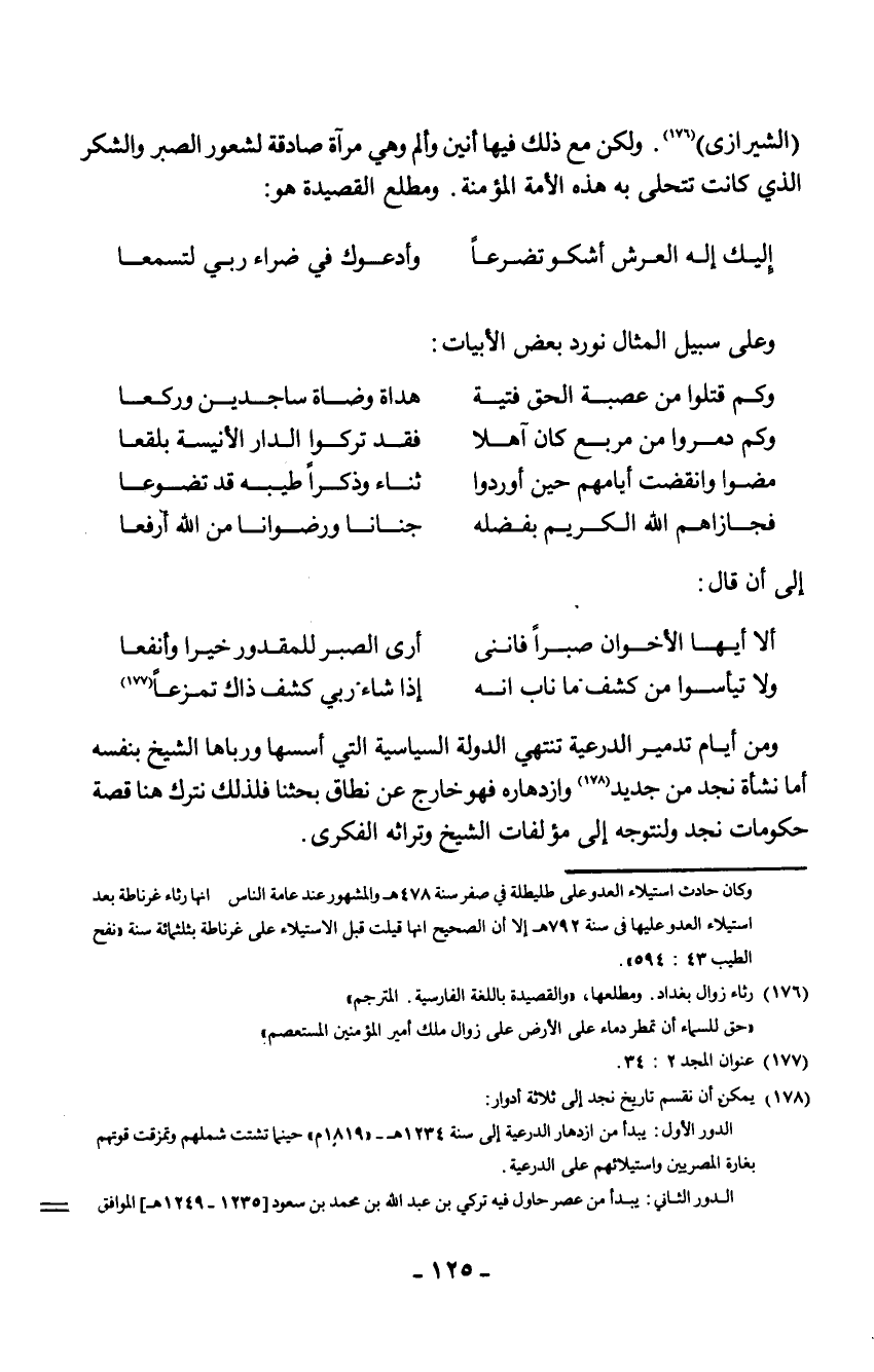 ومن أيام تدمير الدرعية تنتهي الدولة السياسية التي أسسها ورباها الشيخ بنفسه، أما نشأة نجد من جديد3 وازدهاره فهو خارج عن نطاق بحثنا، فلذلك نترك هنا قصة حكومات نجد ولنتوجه إلى مؤلفات الشيخ وتراثه الفكري.
