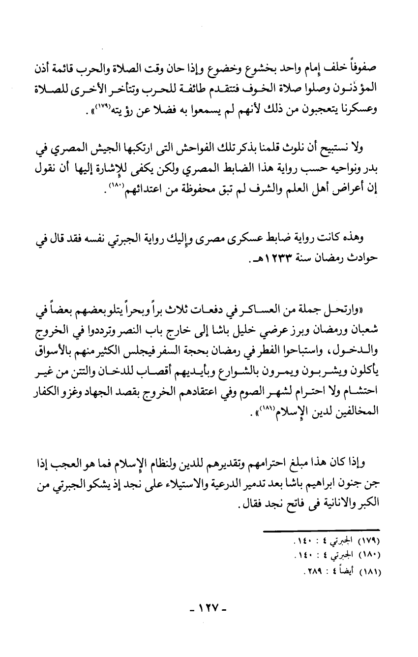 وإذا كان هذا مبلغ احترامهم وتقديرهم للدين ولنظام الإسلام، فما هو العجب إذا جن جنون إبراهيم باشا بعد تدمير الدرعية والاستيلاء على نجد إذ يشكو الجبرتي من الكبر والأنانية في فاتح نجد فقال: