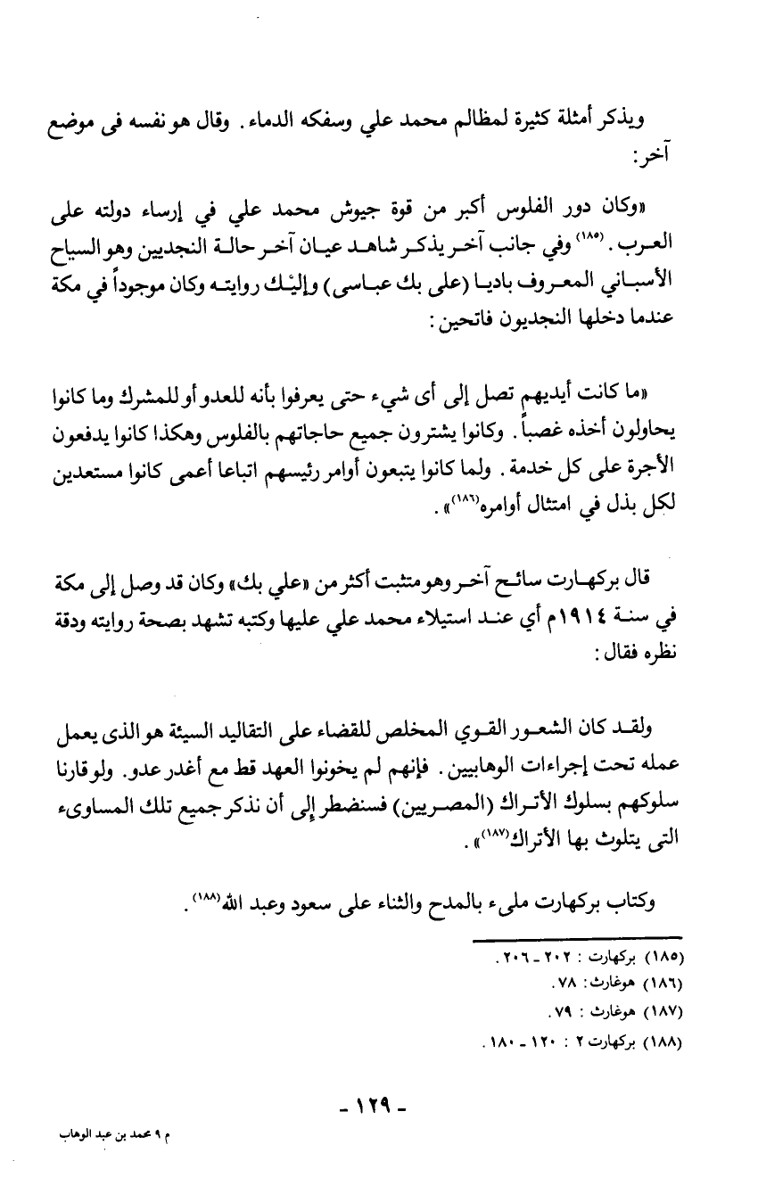 قال بركهارت سائح آخر وهو متثبت أكثر من "علي بك": وكان قد وصل إلى مكة في سنة 1914م أي عند استيلاء محمد علي عليها وكتبه تشهد بصحة روايته ودقة نظره فقال: "ولقد كان الشعور القوي المخلص للقضاء على التقاليد السيئة هو الذي يعمل عمله تحت إجراءات الوهابيين؟ فإنهم لم يخونوا العهد قط مع أغدر عدو، ولو قارنا سلوكهم بسلوك الأتراك (المصريين) فسنضطر إلى أن نذكر جميع تلك المساوئ التي يتلوث بها الأتراك" 3. وكتاب بركهارت مليء بالمدح والثناء على سعود وعبد الله 4.