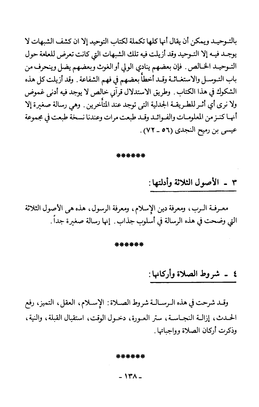 وهي رسالة صغيرة إلا أنها كنز من المعلومات والفوائد، وقد طبعت مرات وعندنا نسخة طبعت في مجموعة عيسى بن رميح النجدي (56 - 72) .
