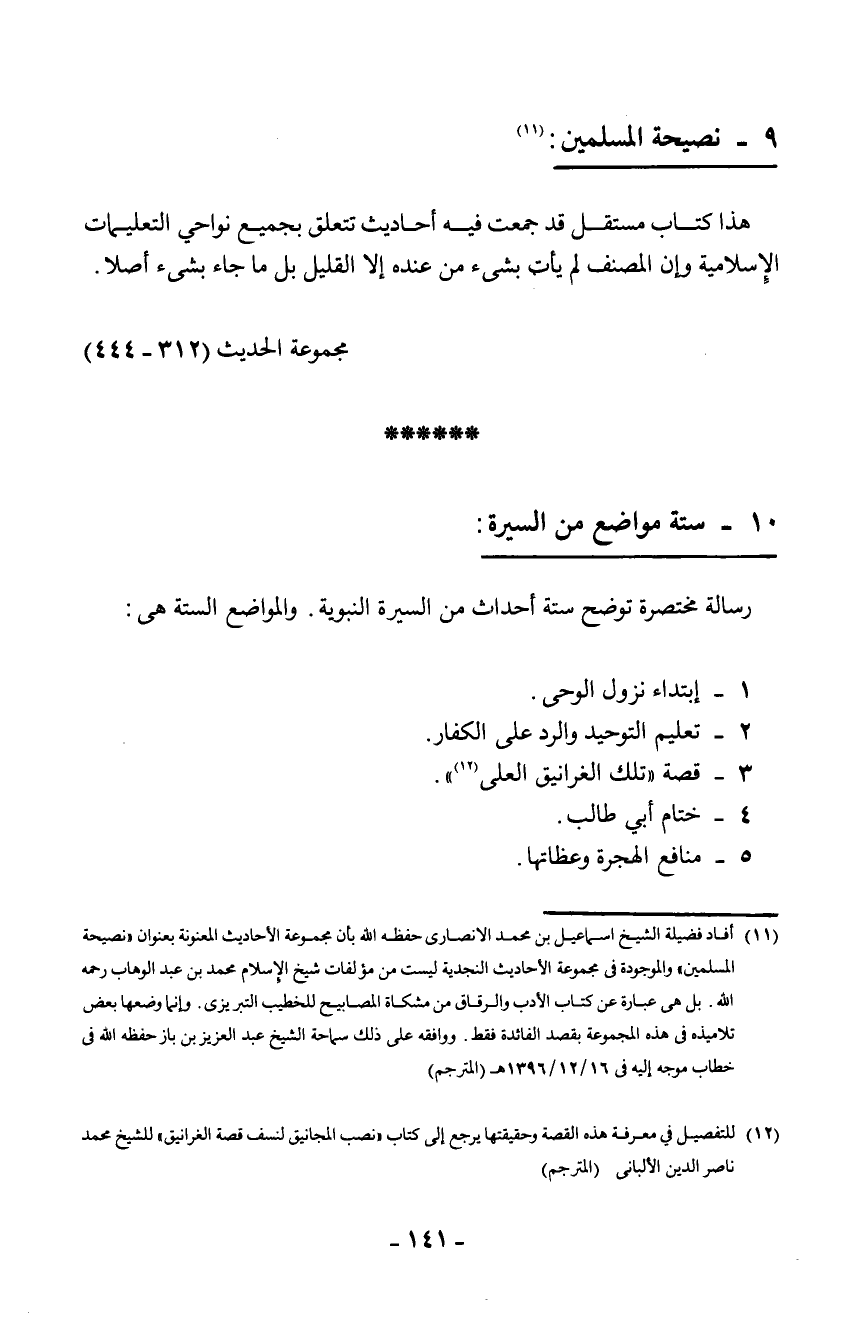 1 أفاد فضيلة الشيخ إسماعيل بن محمد الأنصاري - حفظه الله - بأن مجموعة الأحاديث المعنونة بعنوان "نصيحة المسلمين"، والموجودة في مجموعة الأحاديث النجدية ليست من مؤلفات شيخ الإسلام محمد بن عبد الوهاب رحمه الله. بل هي عبارة عن كتاب الأدب والرقاق من مشكاة المصابيح للخطيب التبريزي، وإنما وضعها بعض تلاميذه في هذه المجموعة بقصد الفائدة فقط، ووافقه على ذلك سماحة الشيخ عبد العزيز بن باز - حفظه الله - في خطاب موجه إليه في 16 / 12 / 1396 هـ (المترجم) .