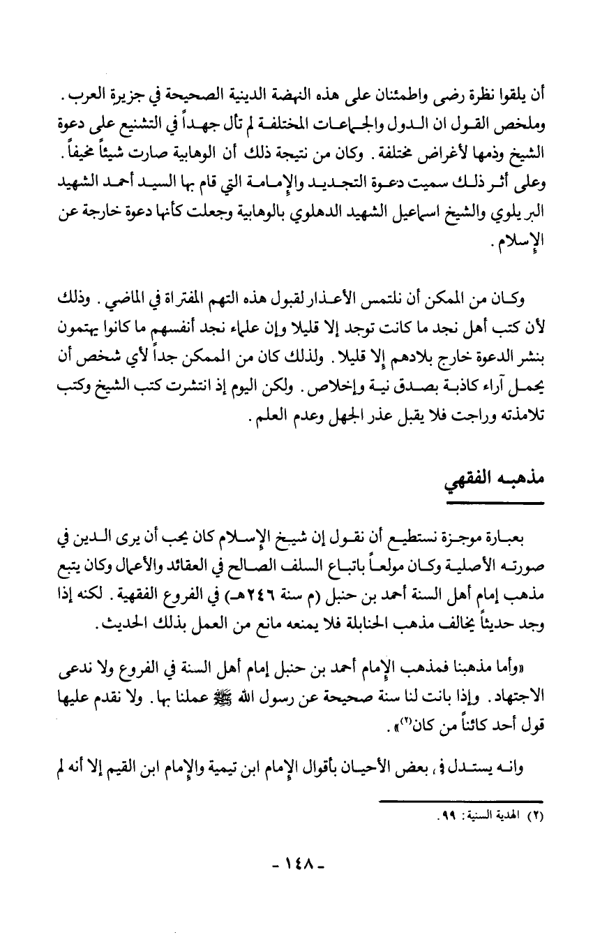 "وأما مذهبنا فمذهب الإمام أحمد بن حنبل إمام أهل السنة في الفروع، ولا ندعي الاجتهاد. وإذا بانت لنا سنة صحيحة عن رسول الله صلى الله عليه وسلم عملنا بها، ولا نقدم عليها قول أحد كائنا من كان "1.
