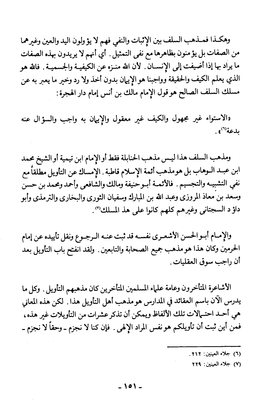 ومذهب السلف هذا ليست مذهب الحنابلة فقط، أو الإمام ابن تيمية أو الشيخ محمد ابن عبد الوهاب، بل هو مذهب أئمة الإسلام قاطبة. الإمساك عن التأويل مطلقا مع نفي التشبيه والتجسيم.