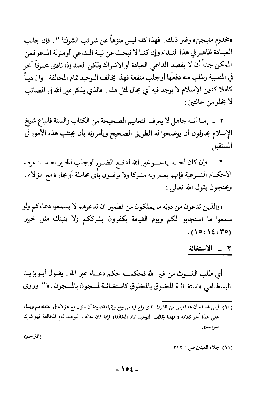1 ليس قصده أن هذا ليس من الشرك الذي وقع فيه من وقع، وإنما مقصوده أن يتنزل مع هؤلاء في اعتقادهم ويدل على هذا آخر كلامه "فهذا يخالف التوحيد تمام المخالفة"، فإذا كان يخالف التوحيد تمام المخالفة فهو شرك صراحة". (المترجم) .