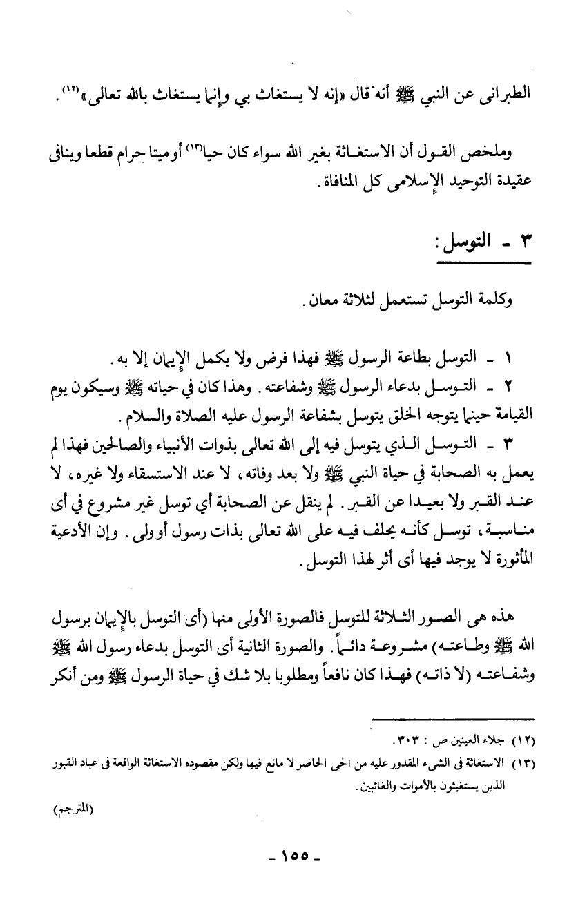 2 الاستغاثة في الشيء المقدور عليه من الحي الحاضر لا مانع فيها، ولكن مقصوده الاستغاثة الواقعة في عباد القبور الذين يستغيثون بالأموات والغائبين. (المترجم) .