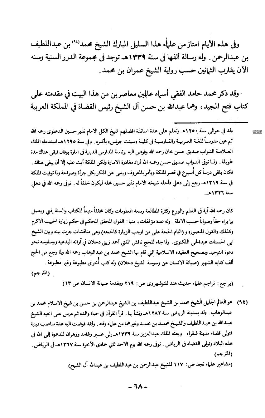 1 هو العالم الجليل الشيخ محمد ابن الشيخ عبد اللطيف ابن الشيخ عبد الرحمن بن حسن ابن شيخ الإسلام محمد بن عبد الوهاب، ولد بمدينة الرياض سنة 1282 هـ ونشأ بها، قرأ القرآن في حياة والده، ثم درس على أخيه الشيخ عبد الله بن عبد اللطيف، والشيخ محمد بن محمد وغيرهما من علماء وقته، ولقد فوضت إليه عدة مناصب دينية، فتولى قضاء مدينة شقرا، وبعثه الملك عبد العزيز سنة 1339 هـ إلى عسير وغامد وزهران للدعوة إلى الله في هذه البلاد، وتولى القضاء في الرياض، توفي - رحمه الله - يوم الأحد ثاني جمادى الآخرة سنة 1367 هـ، في الرياض. (المترجم) (مشاهير علماء نجد ص: 117 للشيخ عبد الرحمن بن عبد اللطيف بن عبد الله آل الشيخ) .