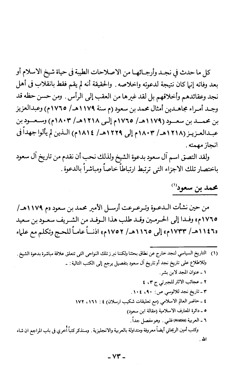 1 التاريخ السياسي لنجد خارج عن نطاق بحثنا، ولكننا نبرز تلك النواحي التي تتعلق علاقة مباشرة بدعوة الشيخ. وللاطلاع على تاريخ نجد أو تاريخ آل سعود بتفصيل يرجع إلى الكتب التالية:- 1- عنوان المجد لابن بشر. 2- عجائب الآثار للجبرتي ج 3 , 4 3- تاريخ نجد للألوسي ص: 90 , 104. 4- حاضر العالم الإسلامي (مع تعليقات شكيب أرسلان) 4: 161 , 172 5- دائرة المعارف الإسلامية (مقالة ابن سعود) 6- العربية (arabia) فلبي. وهو مفصل جدا. وكتب أمين الريحاني أيضا معروفة ومتداولة بالعربية والإنجليزية. وسنذكر كتبا أخرى في باب المراجع إن شاء الله.