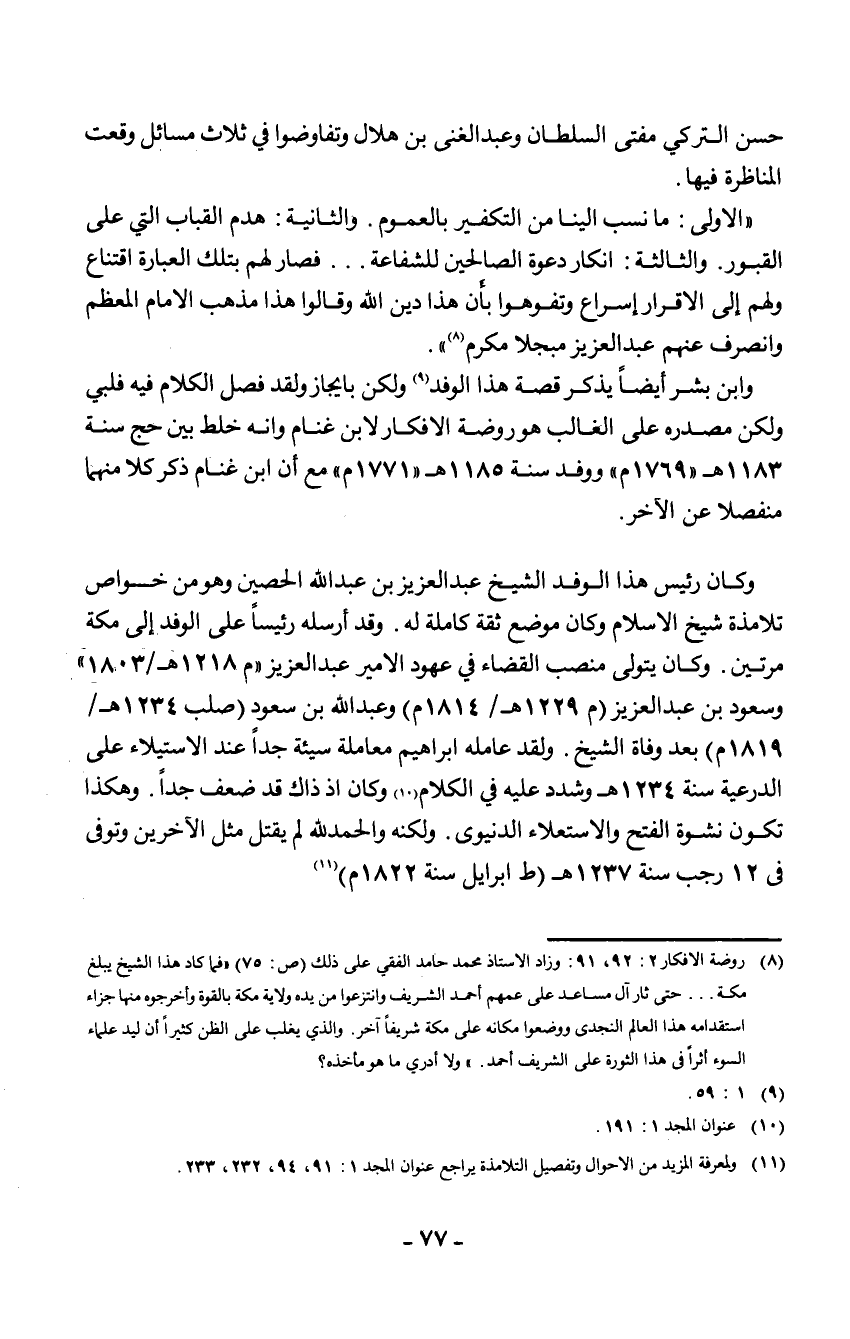 1 روضة الأفكار 2: 91 , 92: وزاد الأستاذ محمد حامد الفقي على ذلك (ص: 75) "فما كاد هذا الشيخ يبلغ مكة ... حتى ثار آل مساعد على عمهم أحمد الشريف، وانتزعوا من يده ولاية مكة بالقوة، وأخرجوه منها جزاء استقدامه هذا العالم النجدي ووضعوا مكانه على مكة شريفا آخر. والذي يغلب على الظن كثيرا أن ليد علماء السوء أثرا في هذا الثورة على الشريف أحمد." ولا أدري ما هو مأخذه؟.