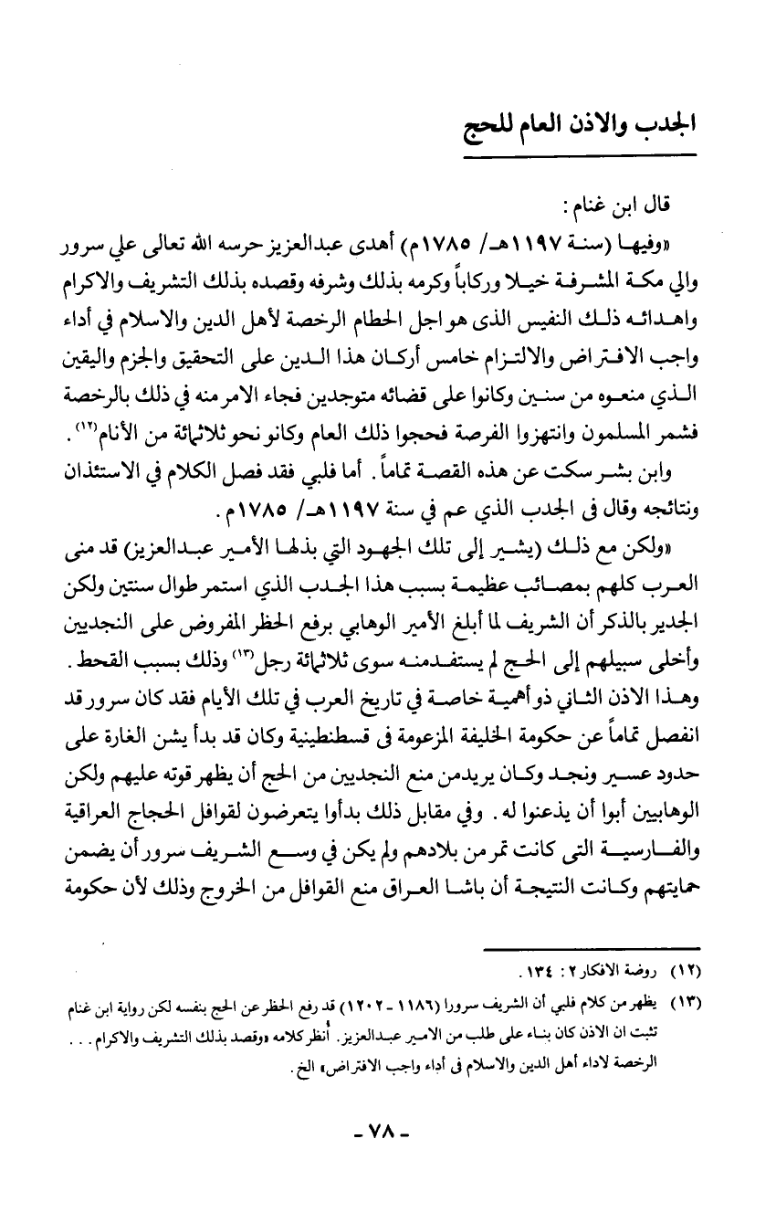 2 يظهر من كلام فلبي أن الشريف سرورا (1186- 1202) قد رفع الحظر عن الحج بنفسه، لكن رواية ابن غنام تثبت أن الأذن كان بناء على طلب من الأمير عبد العزيز. انظر كلامه "وقصد بذلك التشريف والإكرام ... الرخصة لأداء أهل الدين والإسلام في أداء واجب الافتراض" إلخ.