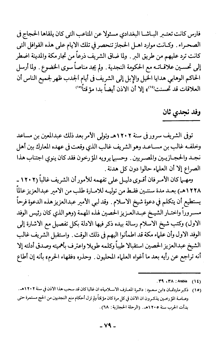 2 ذكر ماردتمان "ابن سعود: دائرة المعارف الإسلامية" أن غالبا كان قد سحب هذا الأذن في سنة 1202 هـ. وعامة المؤرخين يذكرون أن الأذن في كل مرة كان مؤقتا، ولم تزل أحكام منع النجديين من الحج مستمرة حتى بدأت الحرب سنة 1205 هـ. (الرحلة الحجازية: 68) .