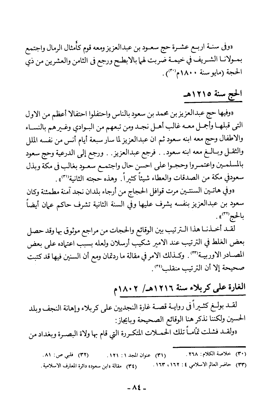 "وفي هاتين السنتين مرت قوافل الحجاج من أرجاء بلدان نجد آمنة مطمئنة، وكان سعود بن عبد العزيز بنفسه يشرف عليها، وفي السنة الثانية تشرف حاكم عمان أيضا بالحج".3