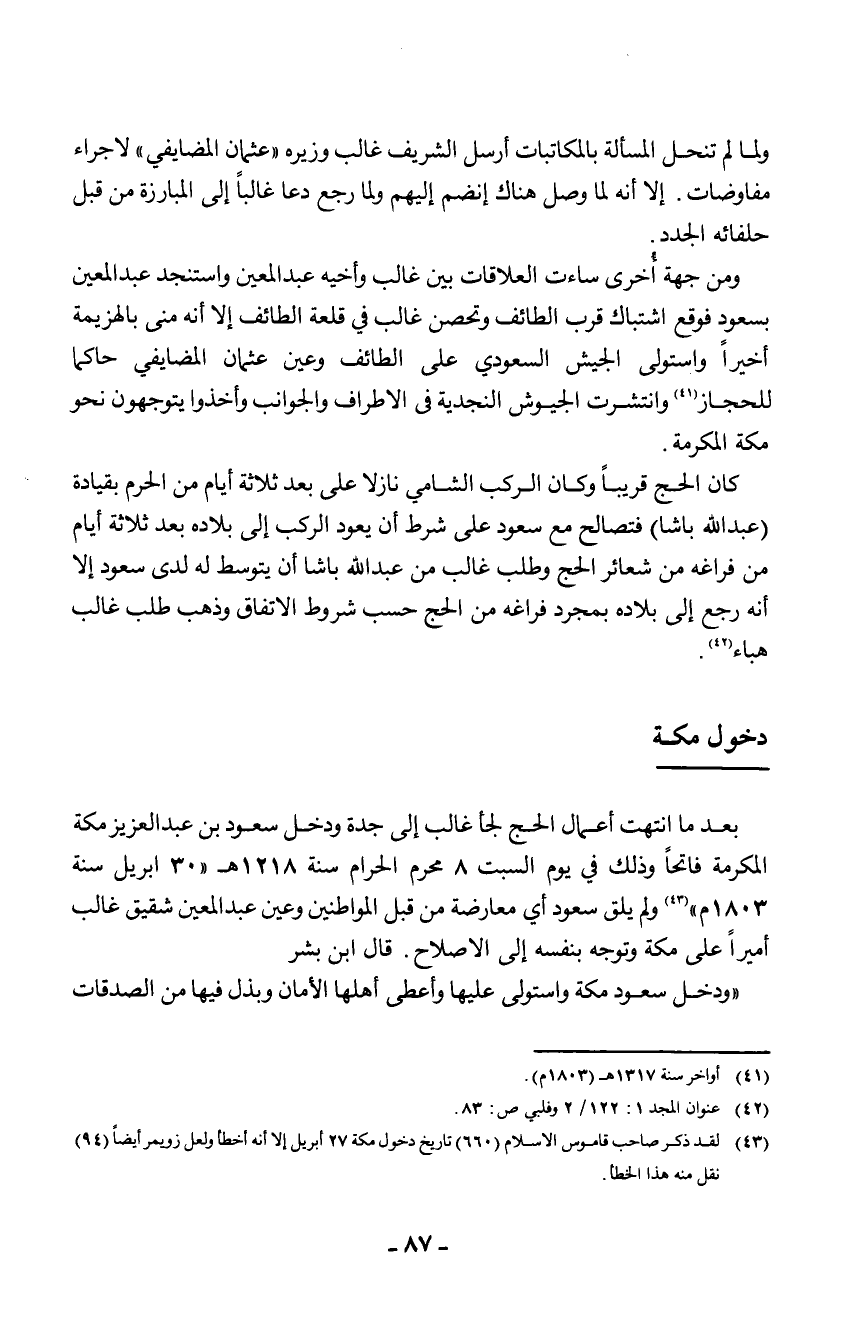 "ودخل سعود مكة واستولى عليها، وأعطى أهلها الأمان وبذل فيها من الصدقات