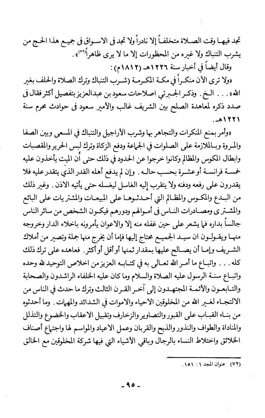 وقال أيضا في أخبار سنة 1226 هـ (1812 م) : "ولا ترى الآن منكرا في مكة المكرمة (شرب التنباك وترك الصلاة والحلف بغير الله" ... الخ.