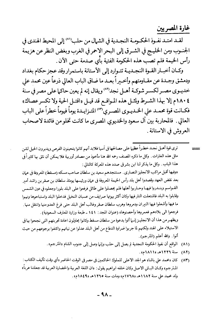 وكان أخبار القوة النجدية تتوارد إلى الآستانة باستمرار، وقد عجز حكام بغداد ودمشق وجدة عن مقاومتهم، وأخيرا بعد ما ضاق الباب العالي ذرعا عين محمد علي خديوي مصر لكسر شوكة أهل نجد2، ويقال: إنه لم يعين حاكما على مصر في سنة 1804 م إلا بهذا الشرط، ولمثل هذه المواقع قد قيل: "اقتل الحية ولا تكسر عصاك"، فكانت قوة محمد علي الخديوي المصري3 المتزايدة يوما فيوما، خطرا على الباب العالي. فالمحاربة بين آل سعود والخديوي المصري ما كانت تخلو من فائدة. لأصحاب العروش في الآستانة.
