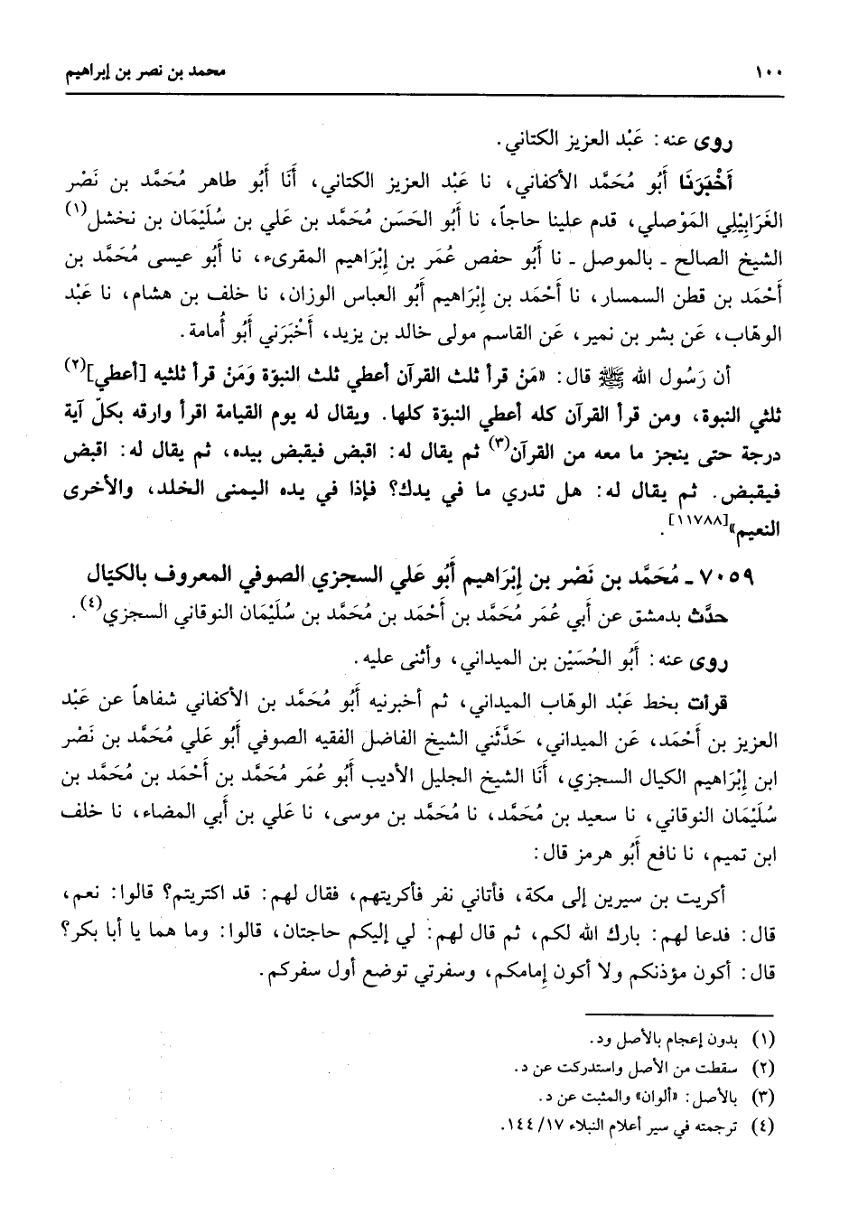 روى عنه عبد العزيز الكتاني أخبرنا أبو محمد الأكفاني نا عبد العزيز الكتاني أنا أبو طاهر محمد بن نصر الغرابيلي الموصلي قدم علينا حاجا نا أبو الحسن محمد بن علي بن سليمان بن نخشل (1) الشيخ الصالح بالموصل نا أبو حفص عمر بن إبراهيم المقرئ نا أبو عيسى محمد بن أحمد بن قطن السمسار نا أحمد بن إبراهيم أبن العباس الوزان نا خلف بن هشام نا عبد الوهاب عن بشر بن نمير عن القاسم مولى خالد بن يزيد أخبرني أبو أمامة أن رسول الله (صلى الله عليه وسلم) قال من قرأ ثلث القرآن أعطي ثلث النبوة ومن قرأ ثلثيه أعطي (2) ثلثي النبوة ومن قرأ القرآن كله أعطي النبوة كلها ويقال له يوم القيامة اقرأ وارقه بكل آية درجة حت ينجز ما معه من القرآن (3) ثم يقال له اقبض فيقبض بيده ثم يقال له اقبض فيقبض ثم يقال له هل تدري ما في يدك فإذا في يده اليمنى الخلد والأخرى النعيم 7059 - محمد بن نصر بن إبراهيم أبو علي السجزي الصوفي المعروف بالكيال حدث بدمشق عن أبي عمر محمد بن أحمد بن محمد بن سليمان النوقاني السجزي (4) روى عنه أبو الحسين بن الميداني وأثنى عليه قرأت بخط عبد الوهاب الميداني ثم أخبرنيه أبن محمد بن الأكفاني شفاها عن عبد العزيز بن أحمد عن الميداني حدثني الشيخ الفاضل الفقيه الصوفي أبو علي محمد بن نصر ابن إبراهيم الكيال السجزي أنا الشيخ الجليل الأديب أبو عمر محمد بن أحمد بن محمد بن سليمان النوقاني نا سعيد بن محمد نا محمد بن موسى نا علي بن أبي المضاء نا خلف ابن تميم نا نافع أبو هرمز قال أكريت بن سيرين إلى مكة فأتاني نفر فأكريتهم فقال لهم قد اكتريتم قالوا نعم قال فدعا لهم بارك الله لكم ثم قال لهم لي إليكم حاجتان قالوا وما هما يا أبا بكر قال أكون مؤذنكم ولا أكون إمامكم وسفرتي توضع أول سفركم