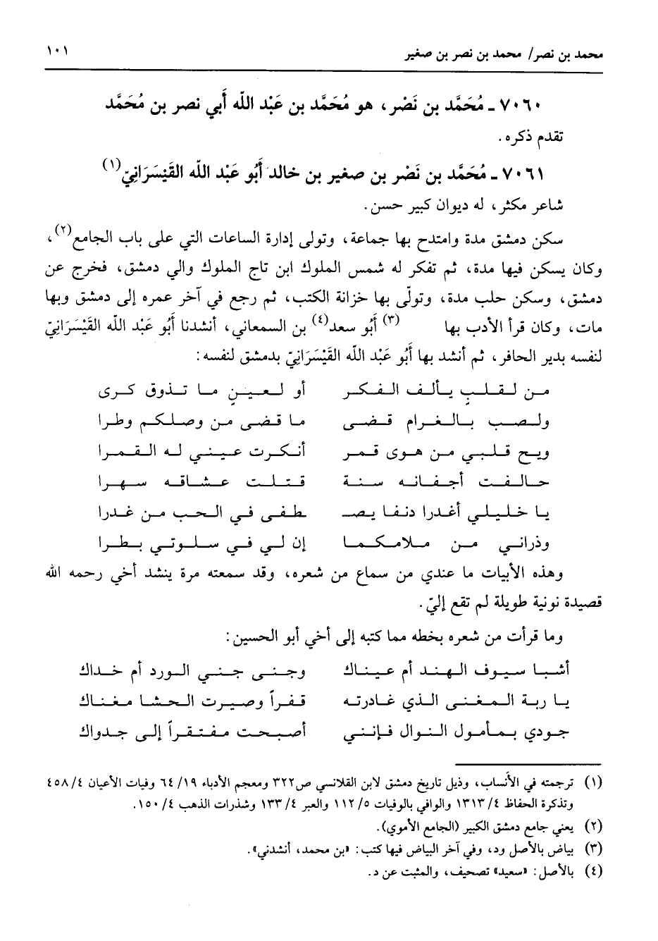 7060 - محمد بن نصر هو محمد بن عبد الله أبي نصر بن محمد تقدم ذكره 7061 - محمد بن نصر بن صغير بن خالد أبو عبد الله القيسراني (1) شاعر مكثر له ديوان كبير حسن سكن دمشق مدة وامتدح بها جماعة وتولى إدارة الساعات التي على باب الجامع (2) وكان يسكن فيها مدة ثم تفكر له شمس الملوك ابن تاج الملوك والي دمشق فخرج عن دمشق وسكن حلب مده وتولى فيها خزانة الكتب ثم رجع في آخر عمره إلى دمشق وبها مات وكان قرأ الأدب بها (3) أبو سعد (4) بن السمعاني أنشدنا أبو عبد الله القيسراني لنفسه بدير الحافر ثم أنشد بها أبو عبد الله القيسراني بدمشق لنفسه * من لقلب يألف الفكر * أو لعين ما تذوق كرى ولصب بالغرام قضى * ما قضى من وصلكم وطرا ويح قلبي من هوى قمر * أنكرت عيني له القمرا حالفت أجفانه سنة * قتلت عشاقه سهرا يا خليلي أغدرا دنفا * يصطفى في الحب من غدرا وذراني من ملامكما * إن لي في سلوتي بطرا * وهذه الأبيات ما عندي من سماع من شعره وقد سمعته مرة ينشد أخي رحمه الله قصيدة نونية طويلة لم تقع إلي وما قرأت من شعره بخطه مما كتبه إلى أخي أبو الحسين * أشبا سيوف الهند أم عيناك * وجنى جني الورد أم خداك يا ربة المغنى الذي غادرته * قفرا وصيرت الحشا مغناك * جودي بمأمول النوال فإنني * أصبحت مفتقرا إلى جدواك
