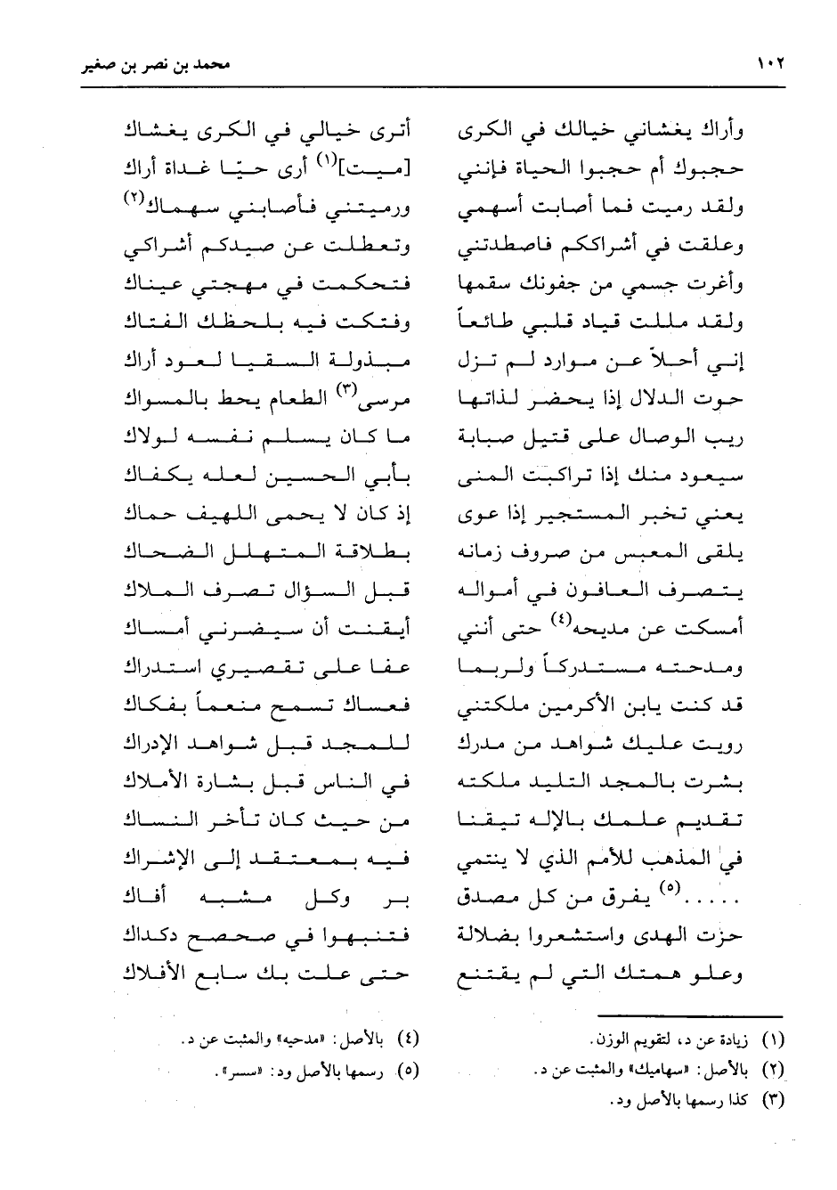 وأراك يغشاني خيالك في الكرى * أترى خيالي في الكرى يغشاك حجبوك أم حجبوا الحياة فإنني * ميت (1) ارى حيا غداة أراك ولقد رميت فما أصابت أسهمي * ورميتني فأصابني سهماك (2) وعلقت في أشراككم فاصطدتني * وتعطلت عن صيدكم أشراكي وأغرت جسمي من جفونك سقمها * فتحكمت في مهجتي عيناك ولقد مللت قياد قلبي طائعا * وفتكت فيه بلحظك الفتاك إني أحلا عن موارد لم تزل * مبذولة السقيا لعود أراك حوت الدلال إذا يحضر لذاتها * مرسى (3) الطعام يحط بالمسواك ريب الوصال على قتيل صبابة * ما كان يسلم نفسه لولاك سيعود منك إذا تراكبت المنى * بأبي الحسين لعله يكفاك يعني تخبر المستجير إذا عوى * إذ كان لا يحمى اللهيف حماك يلقى المعبس من صروف زمانه * بطلاقة المتهلل الضحاك يتصرف العافون في أمواله * قبل السؤال تصرف الملاك أمسكت عن مديحه (4) حتى أنني * أيقنت أن سيضرني أمساك ومدحته مستدركا ولربما * عفا على تقصيري استدراك قد كنت يابن الأكرمين ملكتني * فعساك تسمح منعما بفكاك رويت عليك شواهد من مدرك * للمجد قبل شواهد الأدراك بشرت بالمجد التليد ملكته * في الناس قبل بشارة الأملاك تقديم علمك بالأله تيقنا * من حيث كان تأخر النساك في المذهب للأمم الذي لا ينتمي * فيه بمعتقد إلى الأشراك (5) يفرق من كل مصدق * بر وكل مشبه أفاك حزت الهدى استشعروا بضلالة * فتنبهوا في صحصح دكداك وعلوا همتك التي لم يقتنع * حتى علت بك سابع الأفلاك