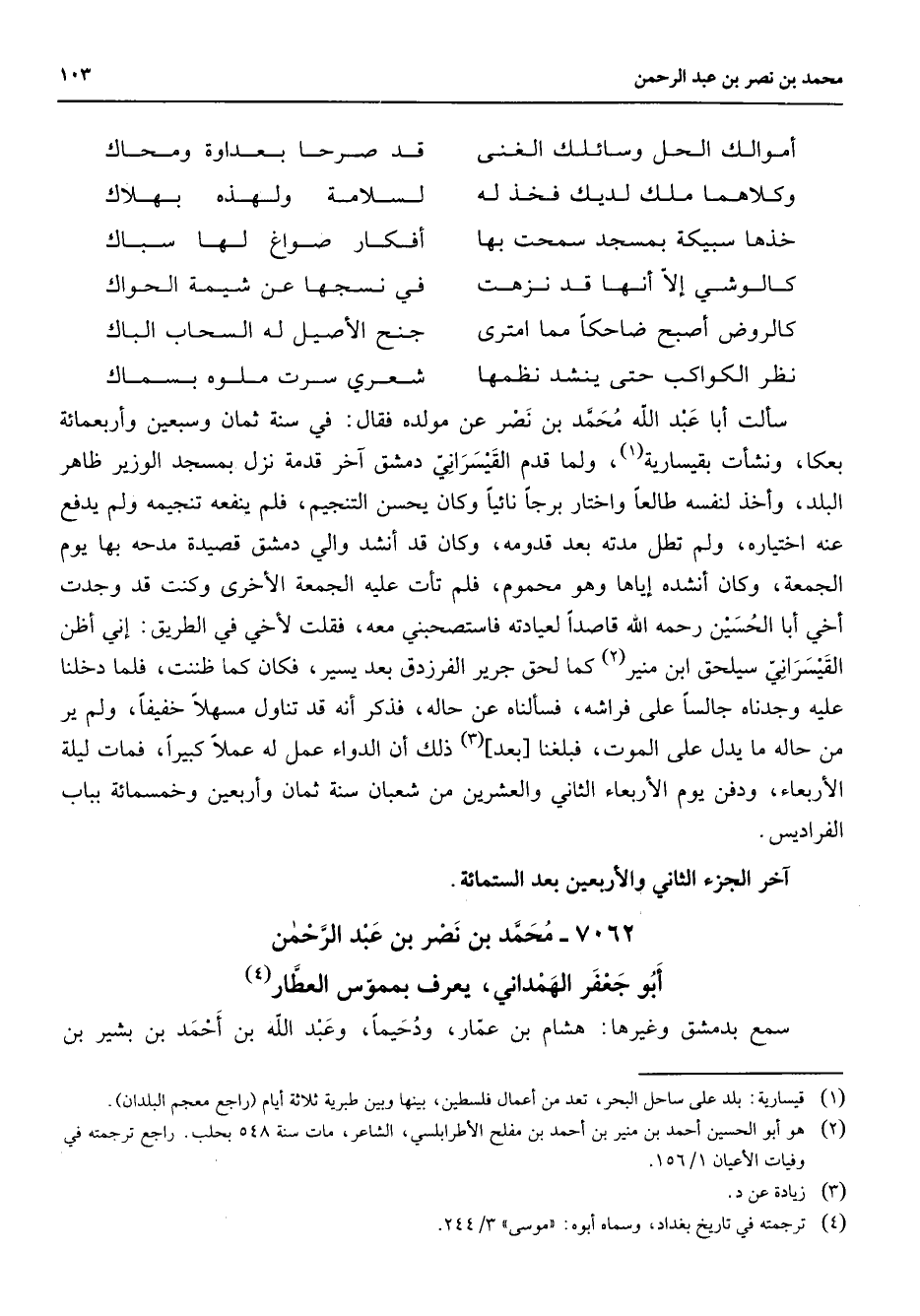 أموالك الحل وسائلك الغنى * قد صرحا بعداوة ومحاك وكلاهما ملك لديك فخذ له * لسلامة ولهذه بهلاك خذها سبيكة بمسجد سمحت بها * أفكار صواغ لها سباك كالوشي إلا أنها قد نزهت * في نسجها عن شيمة الحواك كالروض أصبح ضاحكا مما امترى * جنح الأصيل له السحاب الباك نظر الكواكب حتى ينشد نظمها * شعري سرت ملوه بسماك * سألت أبا عبد الله محمد بن نصر عن مولده فقال في سنة ثمان وسبعين وأربعمائة بعكا ونشأت بقيسارية (1) ولما قدم القيسراني دمشق آخر قدمة نزل بمسجد الوزير ظاهر البلد وأخذ لنفسه طالعا واختار برجا نائيا وكان يحسن التنجيم فلم ينفعه تنجيمه ولم يدفع عنه اختياره ولم تطل مدته بعد قدومه وكان قد أنشد والي دمشق قصيدة مدحه بها يوم الجمعة وكان أنشده إياها وهو محموم فلم تأت عليه الجمعة الأخرى وكنت قد وجدت أخي أبا الحسين رحمه الله قاصدا لعيادته فاستصحبني معه فقلت لأخي في الطريق إني أظن القيسراني سيلحق ابن منير (2) كما لحق جرير الفرزدق بعد يسير فكان كما ظننت فلما دخلنا عليه وجدناه جالسا على فراشه فسألناه عن حاله فذكر أنه قد تناول مسهلا خفيفا ولم ير من حاله ما يدل على الموت فبلغنا بعد (3) ذلك أن الدواء عمل عملا كبيرا فمات ليلة الأربعاء ودفن يوم الأربعاء الثاني والعشرين من شعبان سنة ثمان وأربعين وخمسمائة بباب الفراديس آخر الجزء الثاني والأربعين بعد الستمائة 7062 - محمد بن نصر بن عبد الرحمن أبو جعفر الهمداني يعرف بمموس العطار (4) سمع بدمشق وغيرها هشام بن عمار ودحيما وعبد الله بن أحمد بن بشير بن