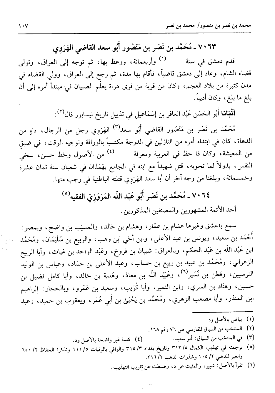 7063 - محمد بن نصر بن منصور أبو سعد القاضي الهروي قدم دمشق في سنة (1) وأربعمائة ووعظ بها ثم توجه إلى العراق وتولى قضاء الشام وعاد إلى دمشق قاضيا فأقام بها مدة ثم رجع إلى العراق وولي القضاء في مدن كثيرة من بلاد العجم وكان من قرية من قرى هراة يعلم الصبيان في مبتدأ أمره إلى أن بلغ ما بلغ وكان أديبا أنبأنا أبو الحسن عبد الغافر بن إسماعيل في تذييل تاريخ نيسابور قال (2) محمد بن نصر بن منصور القاضي أبو سعد (3) الهروي رجل من الرجال داه من الدهاة كان من ابتداء أمره من النازلين في الدرجة مكتسبا بالوراقة وتوجيه الوقت في ضيق من المعيشة وكان ذا حظ في العربية ومعرفة (4) من الأصول وخط حسن سخي النفس بذولا لما تحويه قتل شهيدا مع ابنه في الجامع بهمذان في شعبان سنة ثمان عشرة وخمسمائة وبلغنا من وجه آخر أن أبا سعد الهروي قتلته الباطنية في رجب منها 7064 - محمد بن نصر أبو عبد الله المروزي الفقيه (5) أحد الأئمة المشهورين والمصنفين المذكورين سمع بدمشق وغيرها هشام بن عمار وهشام بن خالد والمسيب بن واضح وبمصر أحمد بن سعيد ويونس بن عبد الأعلى وابن أفي ابن وهب والربيع بن سليمان ومحمد ابن عبد الله بن عبد الحكم وبالعراق شيبان بن فروخ وعبد الواحد بن غياث وأبا الربيع الزهراني ومحمد بن عبيد بن ربيع بن حساب وعبد الأعلى بن حماد وعباس بن الوليد النرسيين وقطن بن نسير (6) وعبيد الله بن معاذ وهدبة بن خالد وأبا كامل فضيل بن حسين وهناد بن السري وابن النمير وأبا كريب وسعيد بن عمرو وبالحجاز إبراهيم بن المنذر وأبا مصعب الزهري ومحمد بن يحيى بن أبي عمر ويعقوب بن حميد وعبد