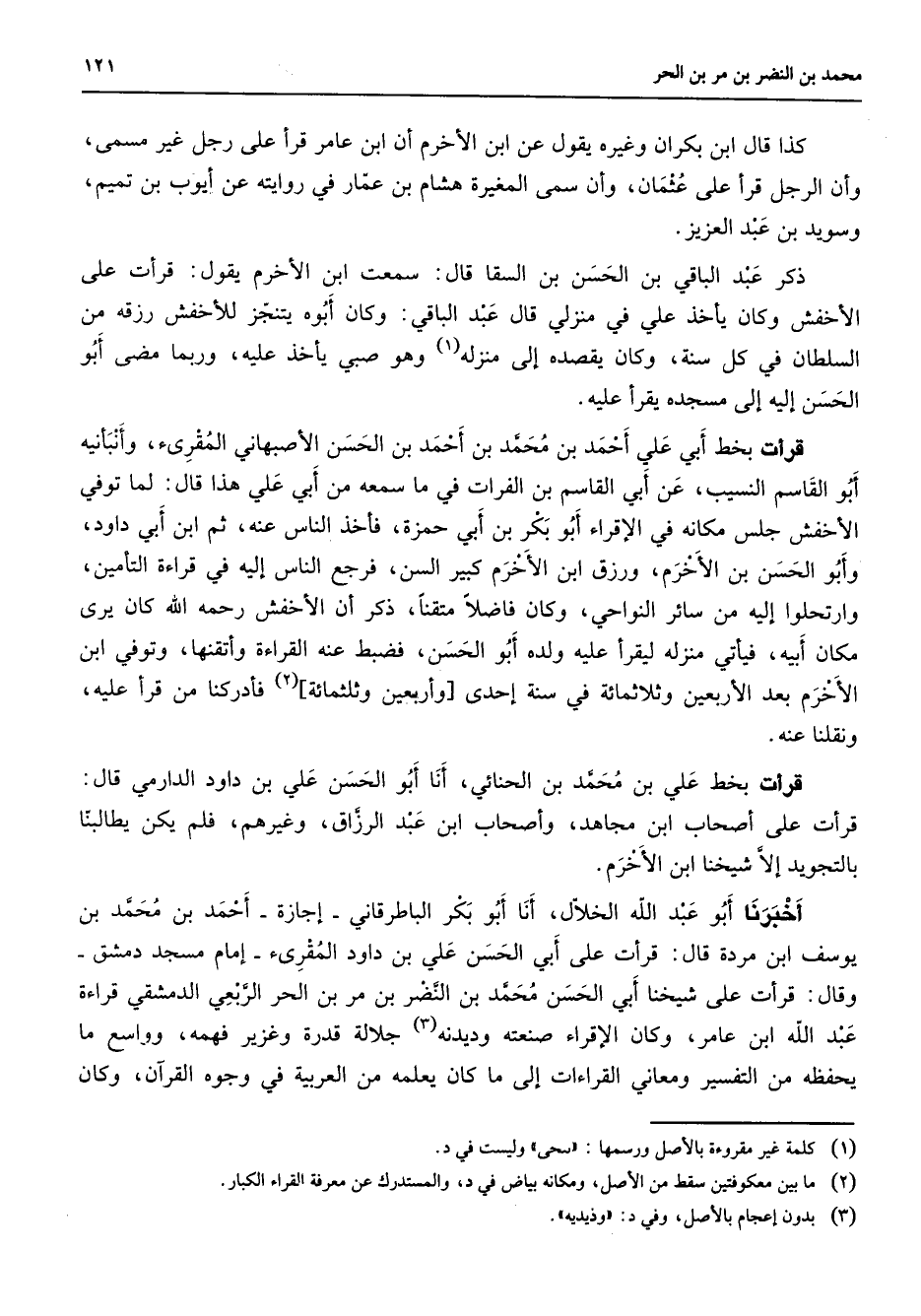 كذا قال ابن بكران وغيره يقول عن ابن الأخرم أن ابن عامر قرأ على رجل غير مسمى وأن الرجل قرأ على عثمان وأن سمى المغيرة هشام بن عمار في روايته عن أيوب بن تميم وسويد بن عبد العزيز ذكر عبد الباقي بن الحسن بن السقا قال سمعت ابن الأخرم يقول قرأت على الأخفش وكان يأخذ علي في منزلي قال عبد الباقي وكان أبوه يتنجز للأخفش رزقه من السلطان في كل سنة وكان يقصده إلى منزله (1) وهو صبي يأخذ عليه وربما مضى أبو الحسن إليه إلى مسجده يقرأ عليه قرأت بخط أبي علي أحمد بن محمد بن أحمد بن الحسن الأصبهاني المقرئ وأنبأنيه أبو القاسم النسيب عن أبي القاسم بن الفرات في ما سمعه من أبي علي هذا قال لما توفي الأخفش جلس مكانه في الإقراء أبو بكر بن أبي حمزة فأخذ الناس عنه ثم ابن أبي داود وأبو الحسن بن الأخرم ورزق ابن الأخرم كبير السن فرجع الناس إليه في قراءة التأمين وارتحلوا إليه من سائر النواحي وكان فاضلا متقنا ذكر أنا الأخفش رحمه الله كان يرى مكان أبيه فيأتي منزله ليقرأ عليه ولده أبو الحسن فضبط عنه القراءة وأتقنها وتوفي ابن الأخرم بعد الأربعين وثلاثمائة في سنة إحدى وأربعين وثلثمائة (2) فأدركنا من قرأ عليه ونقلنا عنه قرأت بخط علي بن محمد بن الحنائي أنا أبو الحسن علي بن داود الدارمي قال قرأت على أصحاب ابن مجاهد وأصحاب ابن عبد الرزاق وغيرهم فلم يكن يطالبنا بالتجويد إلا شيخنا ابن الأخرم أخبرنا أبو عبد الله الخلال أنا أبو بكر الباطرقاني إجازة أحمد بن محمد بن يوسف ابن مردة قال قرأت على أبي الحسن علي بن داود المقرئ إمام مسجد دمشق وقال قرأت على شيخنا أبي الحسن محمد بن النضر بن مر بن الحر الربعي الدمشقي قراءة عبد الله ابن عامر وكان الإقراء صنعته وديدنه (3) جلالة قدره وغزير فهمه وواسع ما يحفظه من التفسير ومعاني القراءات إلى ما كان يعلمه من العربية في وجوه القرآن وكان